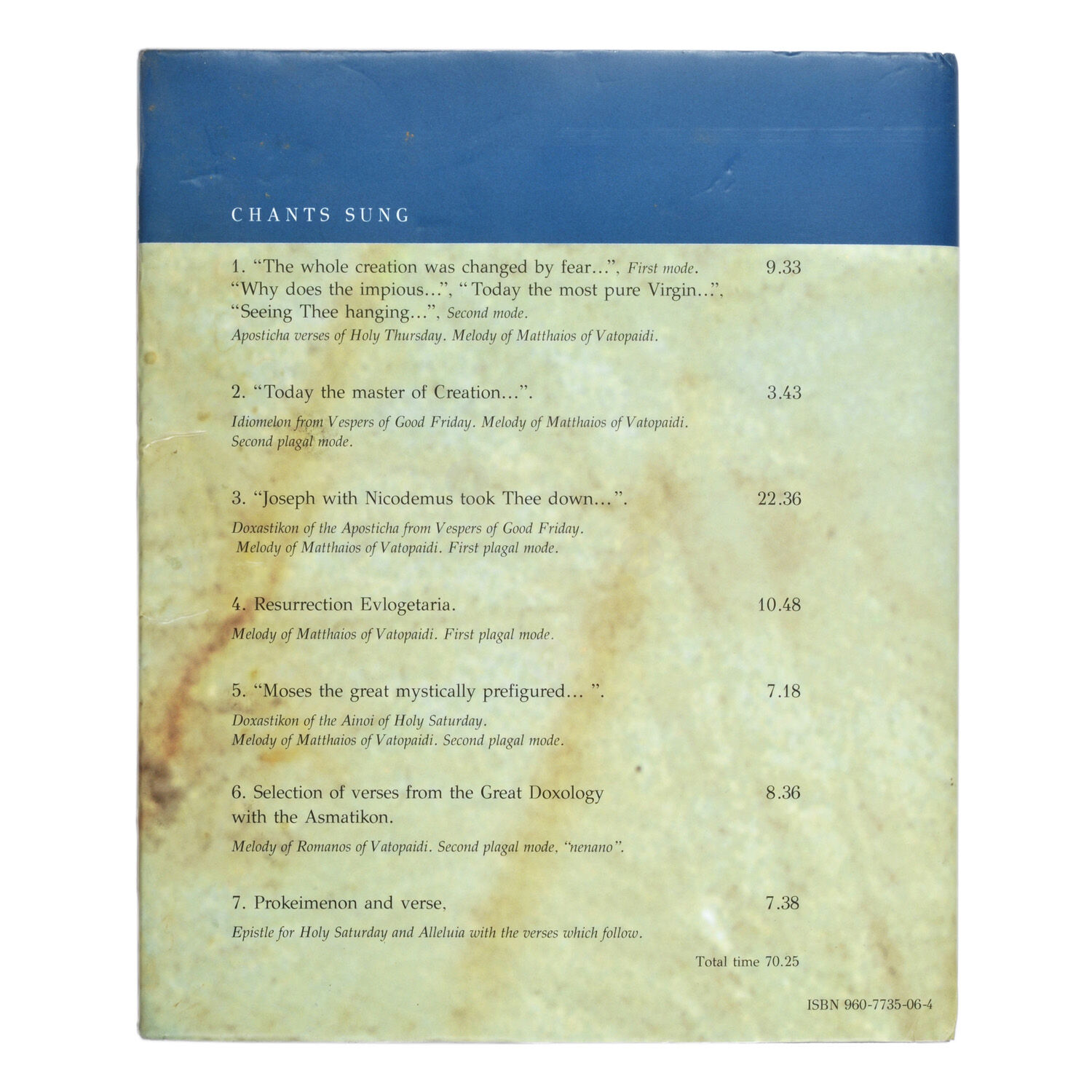 Ηχογράφηση της ακολουθίας της Μεγάλης Εβδομάδας. Περιέχει βιβλιαράκι με τους ψαλμούς και τις νότες της ψαλμωδίας. Ψάλλουν οι Βατοπαιδινοί Πατέρες.