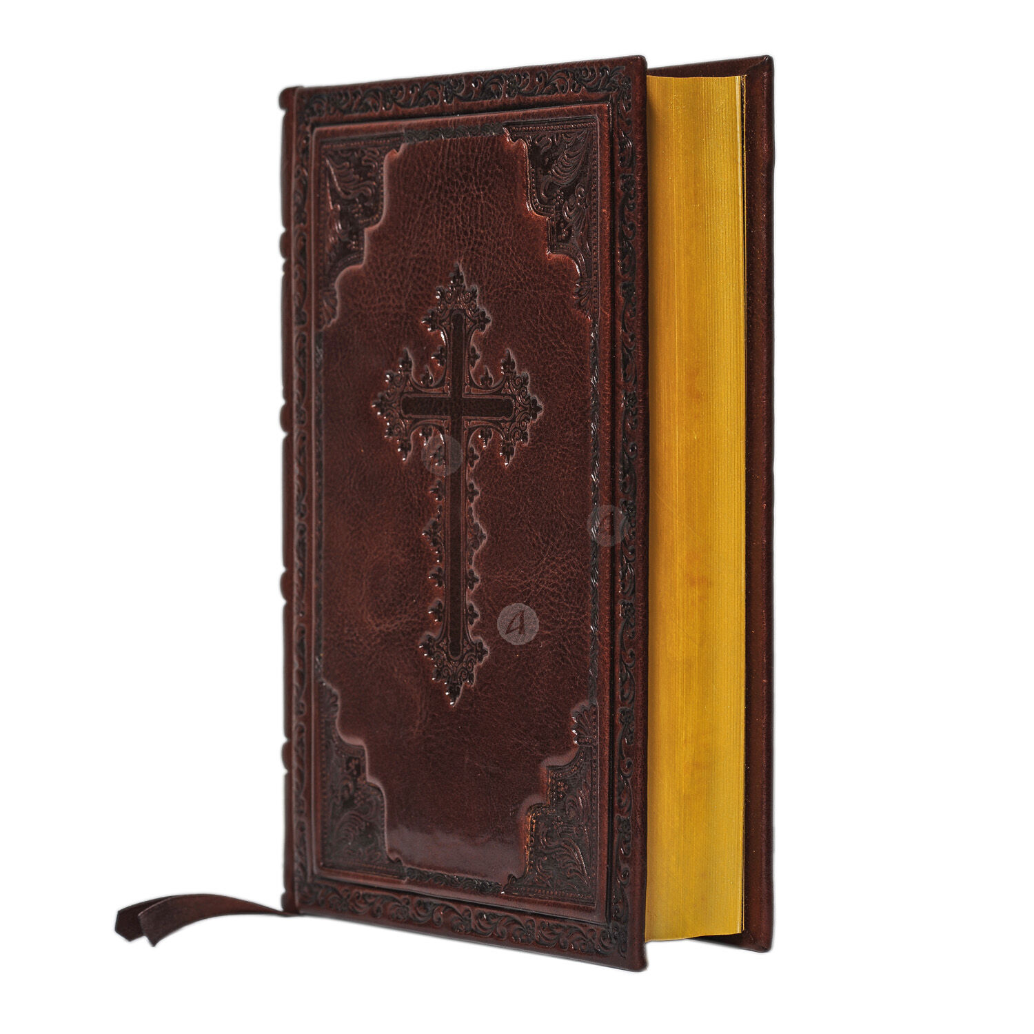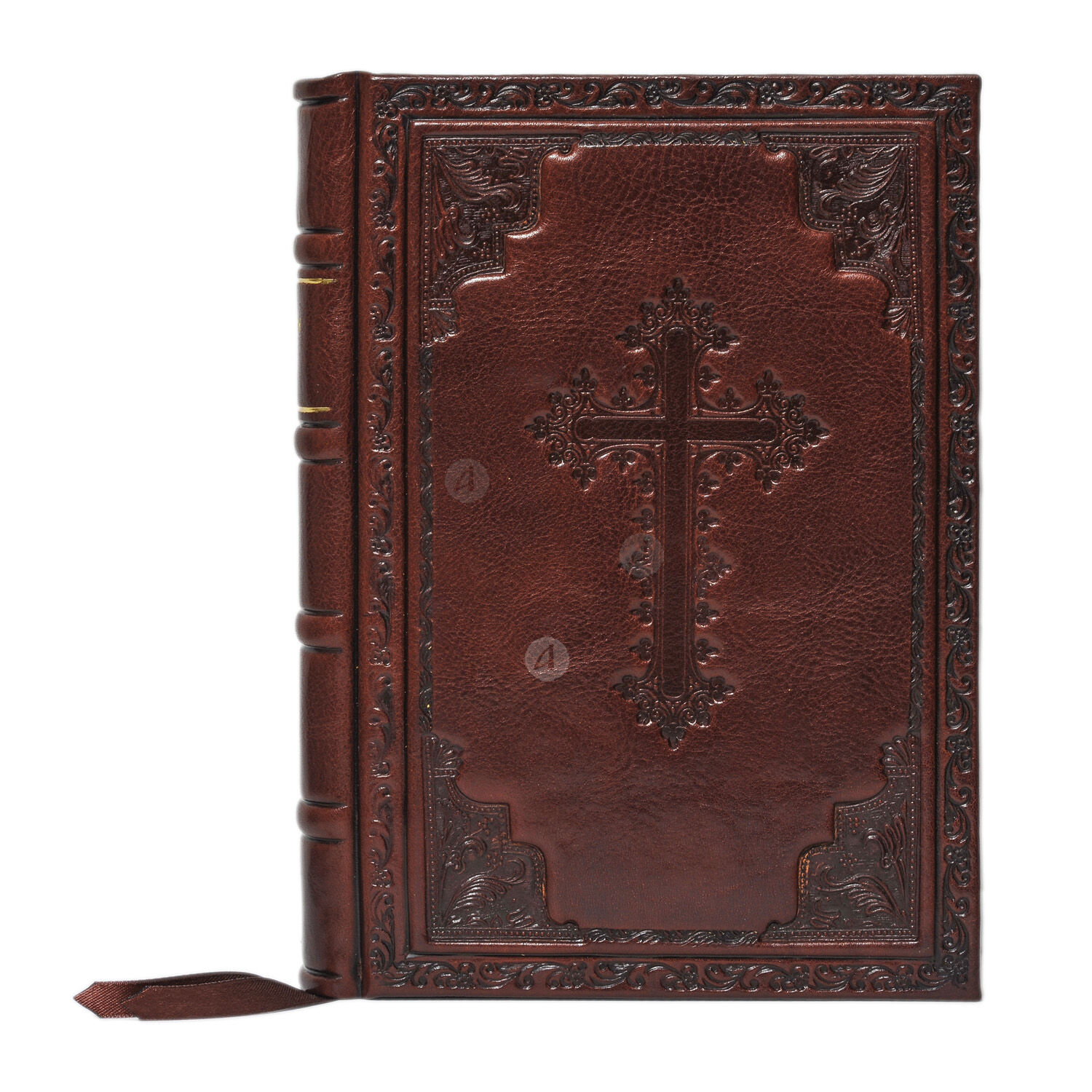 Handmade leather binding and lettering from 24ct gold leaf hagiography. Dimensions: 24x17, Pages: 685