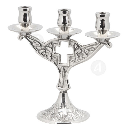 Orthodox nickel plated triple candlestick (candle holder) from Mount Athos with engraved decoration.