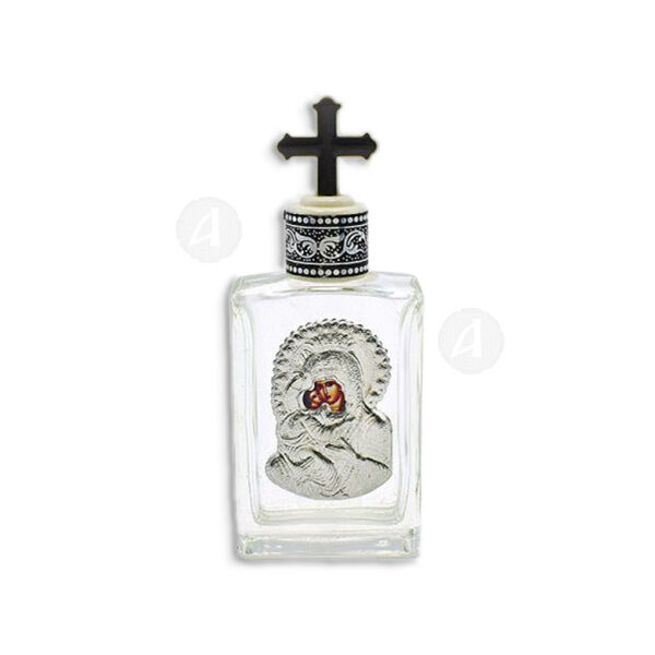 Glass holy water bottle in flat shape, decorated with a silver-plated icon of Virgin Mary. It has a plastic screw cap with a cross.
