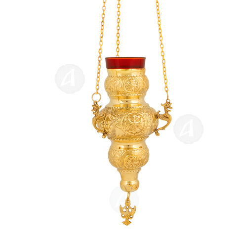 Orthodox gold plated hanging vigil oil lamp with carved decoration and red glass cup.