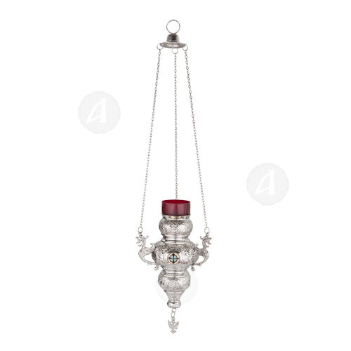 Orthodox nickel plated hanging vigil lamp with engraved decoration and glass cup for oil.