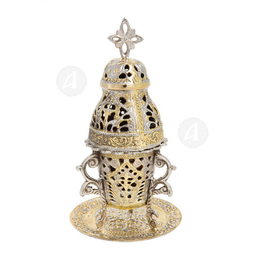 Orthodox home table vigil oil lamp with nickel plating and carved decoration.