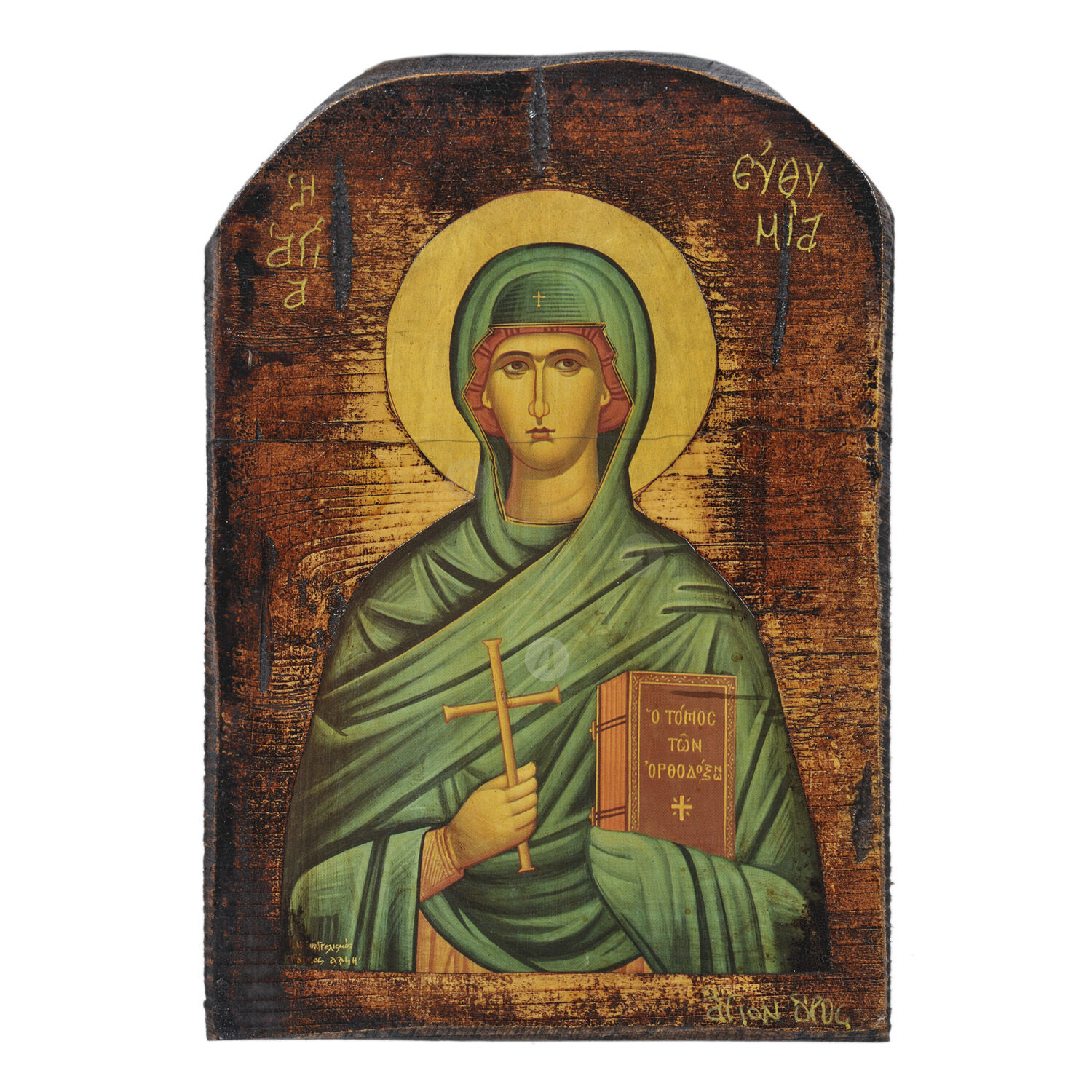 Λιθογραφία (εικόνα) της Αγίας Ευθυμίας παλαιωμένη σε ξύλο πεύκου με τρέσες.