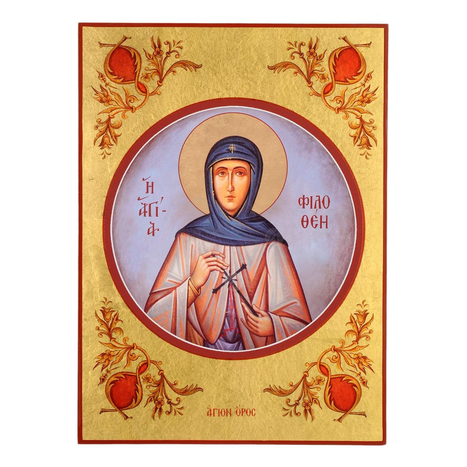 Μεταξοτυπία (εικόνα) της Αγίας Φιλοθέης σε ξύλο με πραγματικό φύλλο χρυσού.