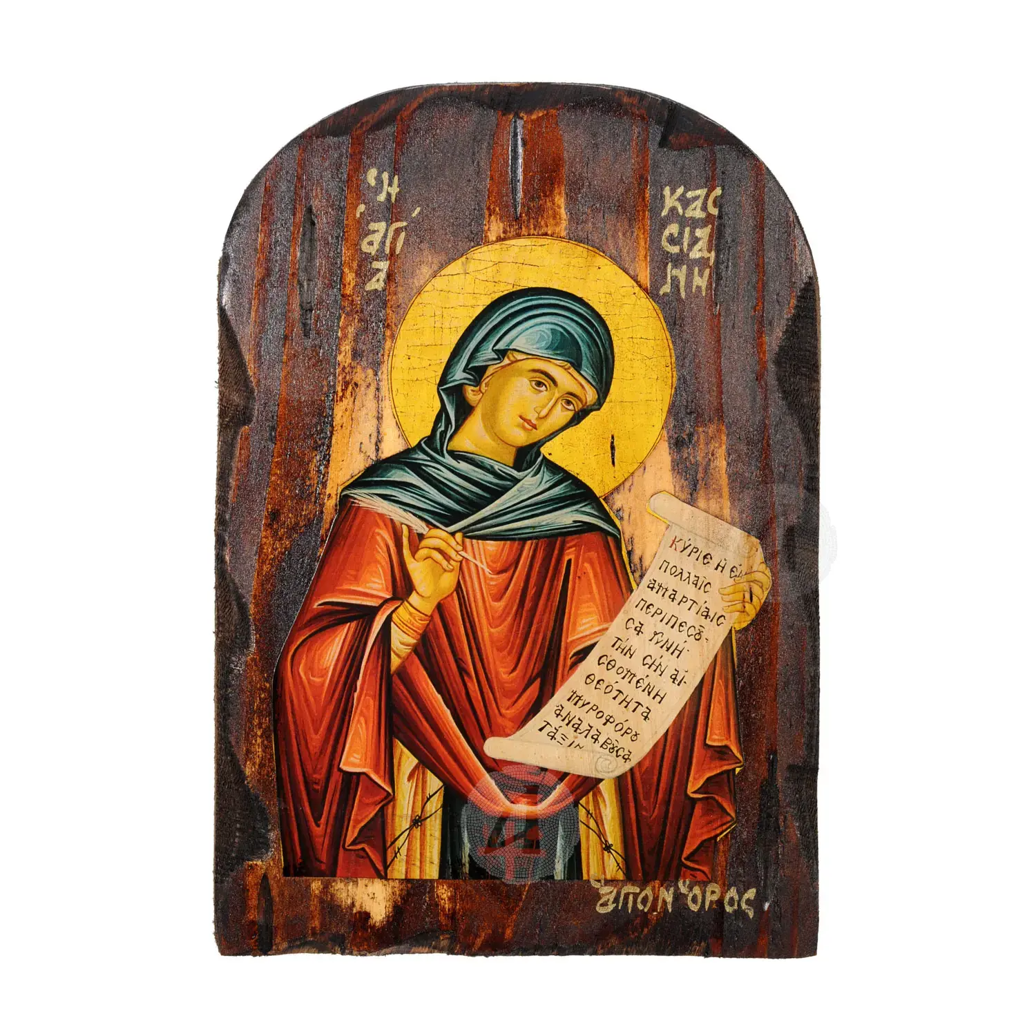 Λιθογραφία (εικόνα) της Αγίας Κασσιανής παλαιωμένη σε ξύλο πεύκου με τρέσες.