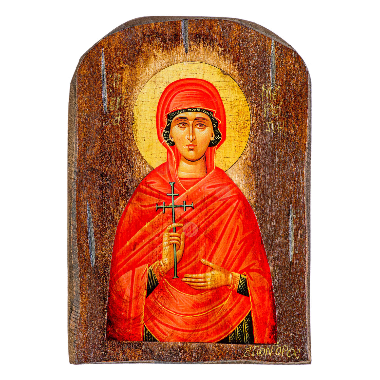 Λιθογραφία (εικόνα) της Αγίας Μερόπης της Μάρτυρος παλαιωμένη σε ξύλο πεύκου με τρέσες.
