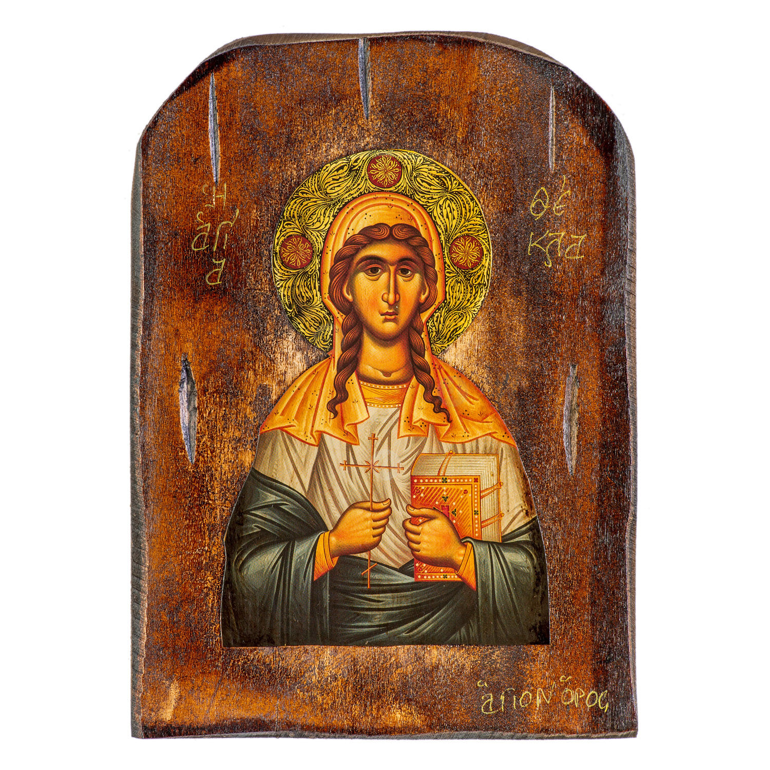 Λιθογραφία (εικόνα) της Αγίας Θέκλας της Ισαποστόλου παλαιωμένη σε ξύλο πεύκου με τρέσες.