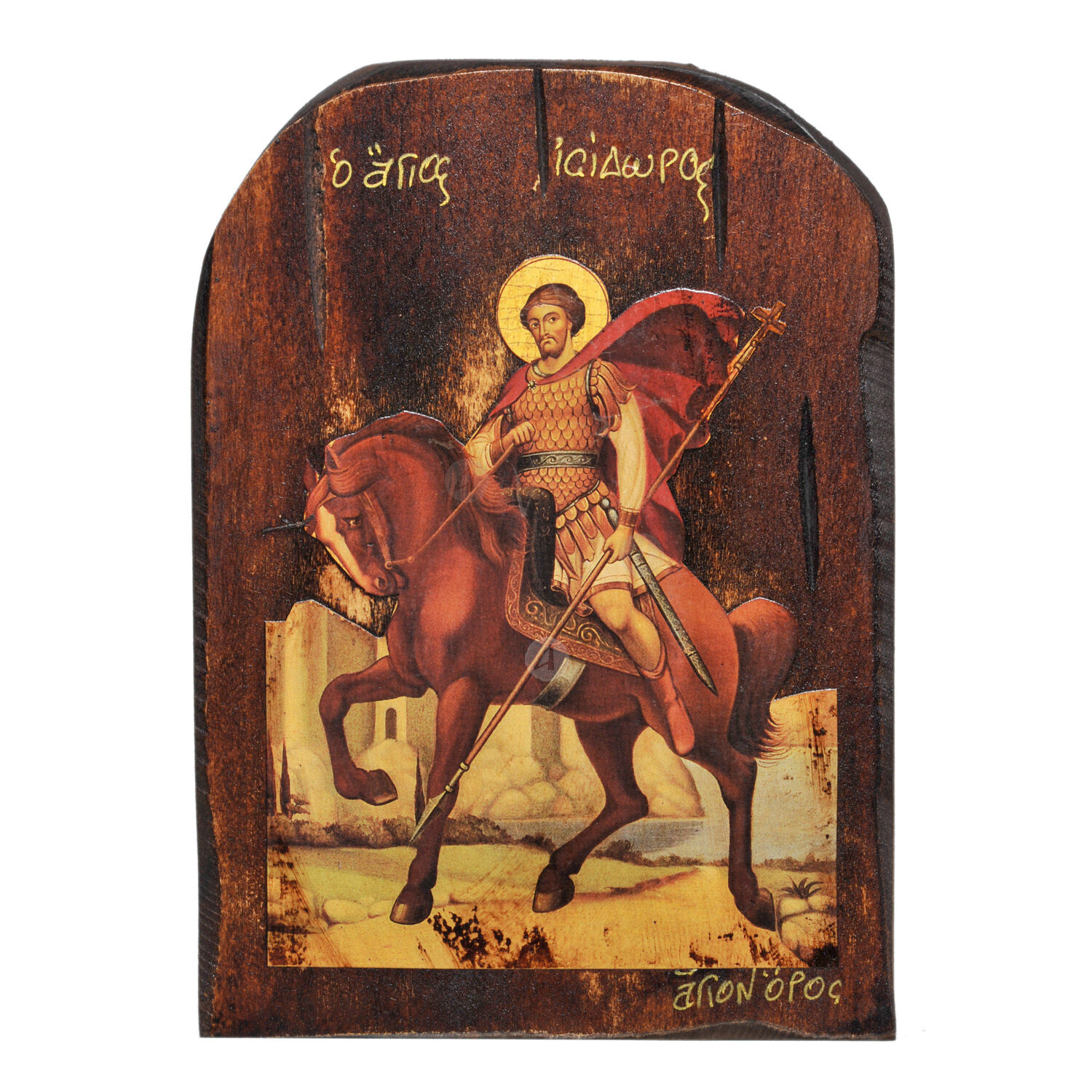 Λιθογραφία (εικόνα) του Αγίου Ισιδώρου, του μάρτυρα της Χίου, παλαιωμένη σε ξύλο πεύκου με τρέσες.
