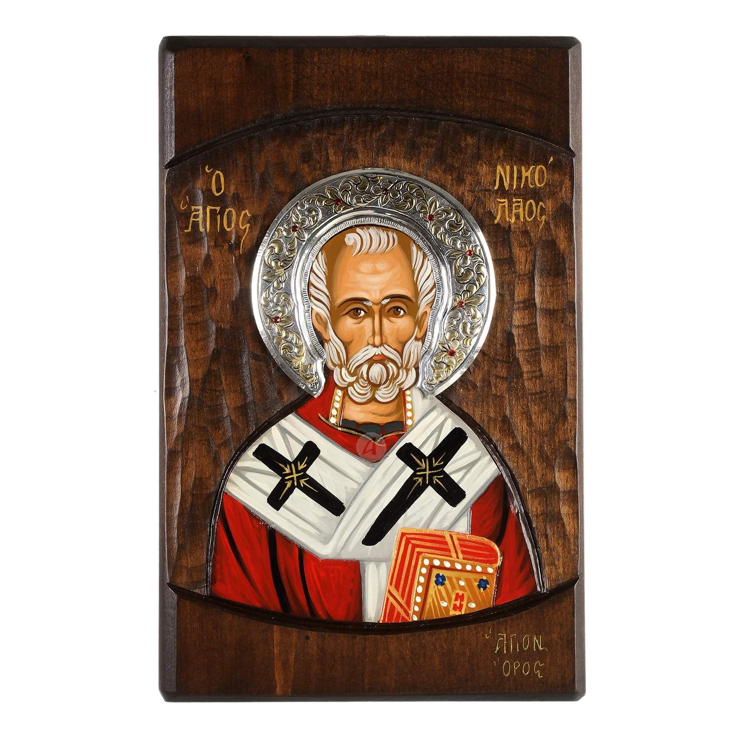 Αγιογραφία σε φυσικό ξύλο με φωτοστέφανο από ασήμι 925° που έχει επιχρυσωμένες λεπτομέρειες και ημιπολύτιμους λίθους.