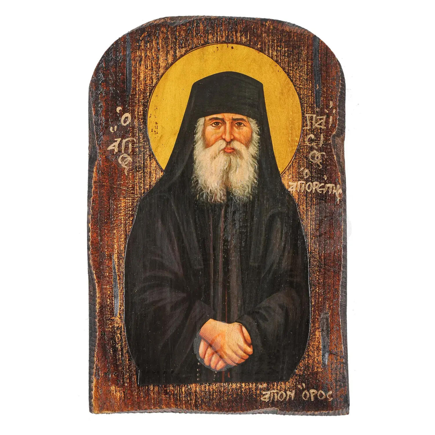 Λιθογραφία (εικόνα) του Αγίου Παϊσίου του Αγιορείτη παλαιωμένη σε ξύλο πεύκου με τρέσες.