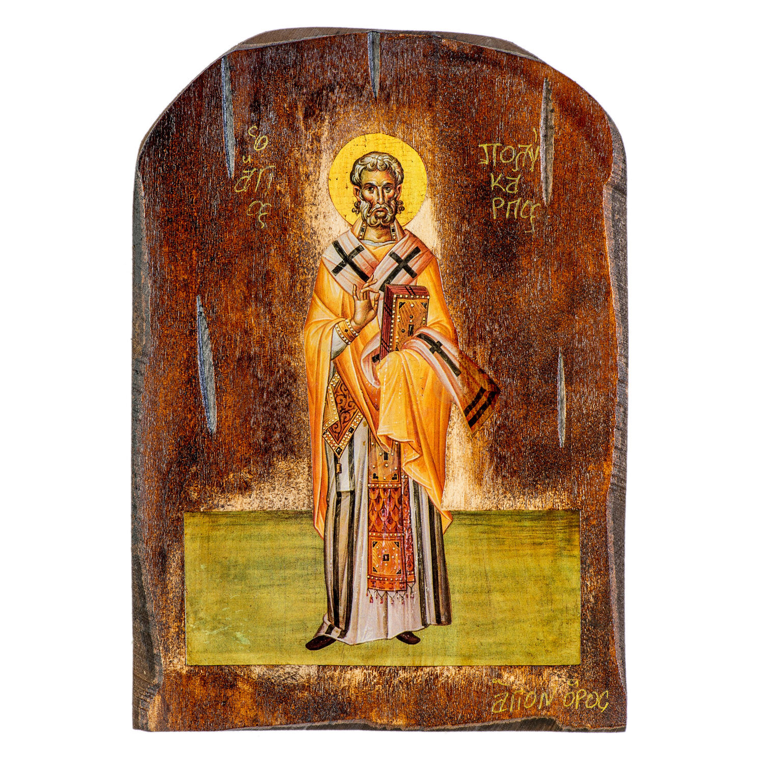 Λιθογραφία (εικόνα) του Αγίου Πολυκάρπου παλαιωμένη σε ξύλο πεύκου με τρέσες.