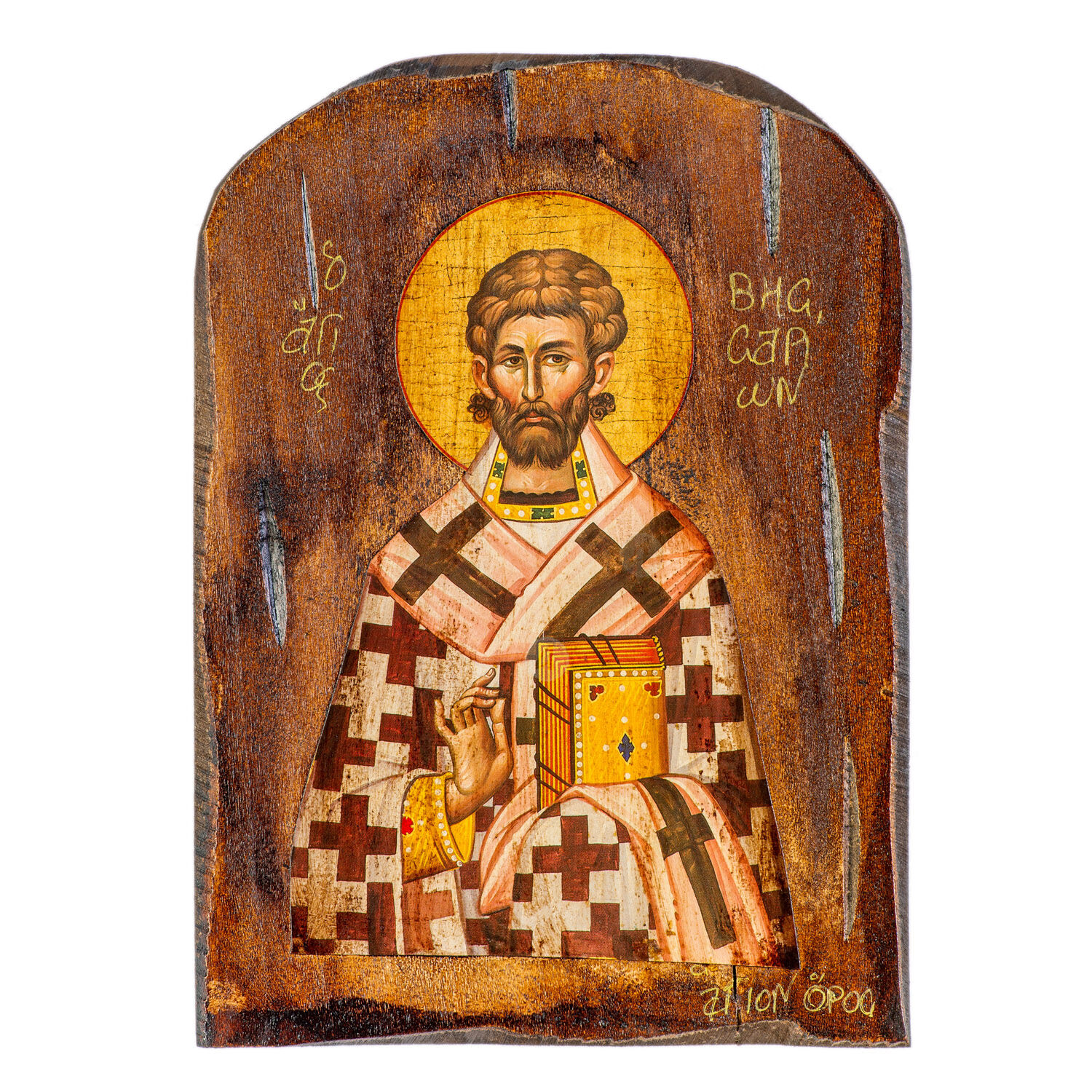 Λιθογραφία (εικόνα) του Αγίου Βησσαρίωνα, Αρχιεπισκόπου Λαρίσης, παλαιωμένη σε ξύλο πεύκου με τρέσες.