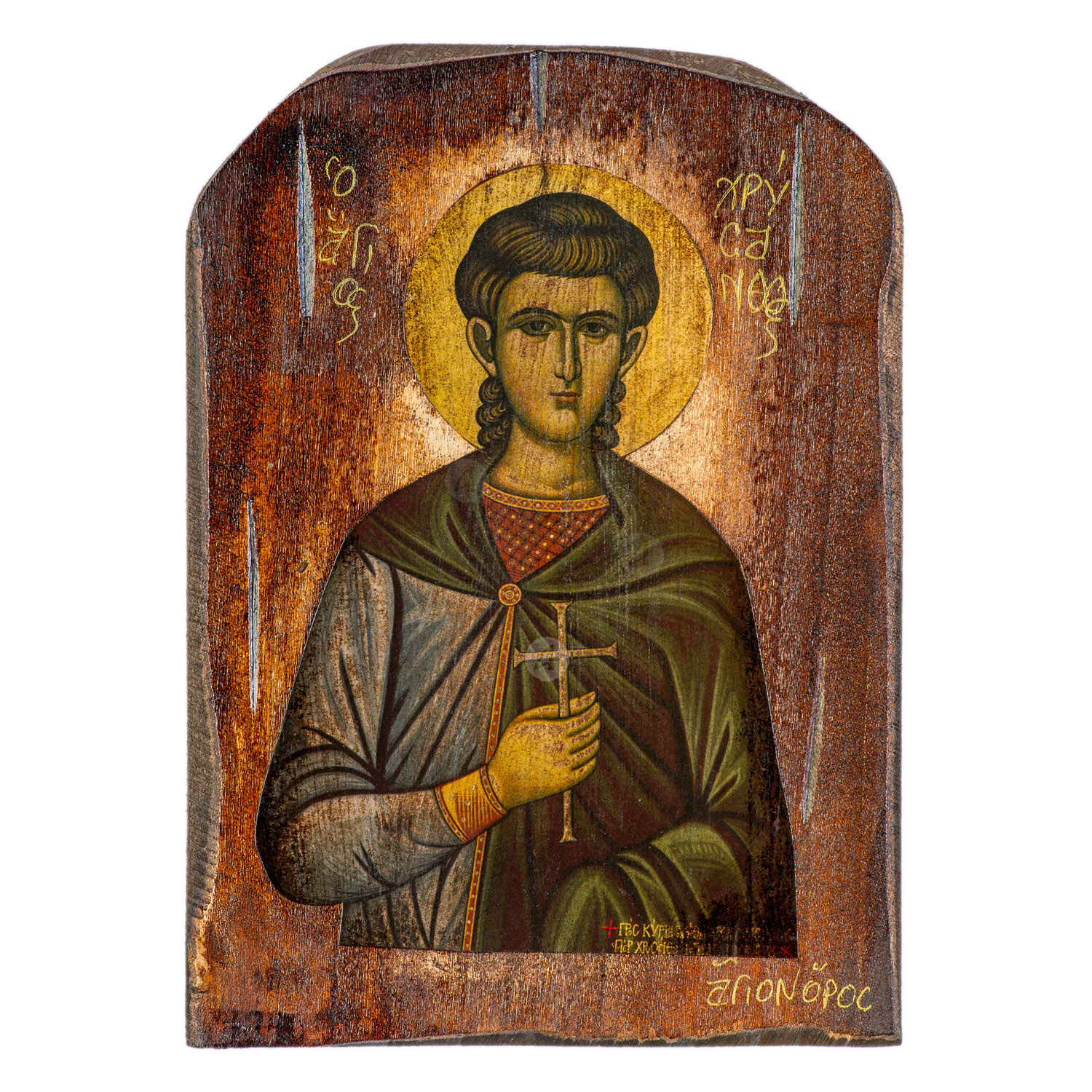 Λιθογραφία (εικόνα) του Αγίου Χρύσανθου του Μάρτυρα παλαιωμένη σε ξύλο πεύκου με τρέσες.