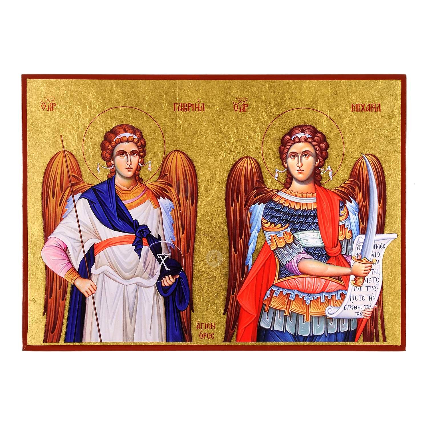 Αγιορείτικη μεταξοτυπία (εικόνα) των Αρχαγγέλων Γαβριήλ και Μιχαήλ σε ξύλο με πραγματικό φύλλο χρυσού.