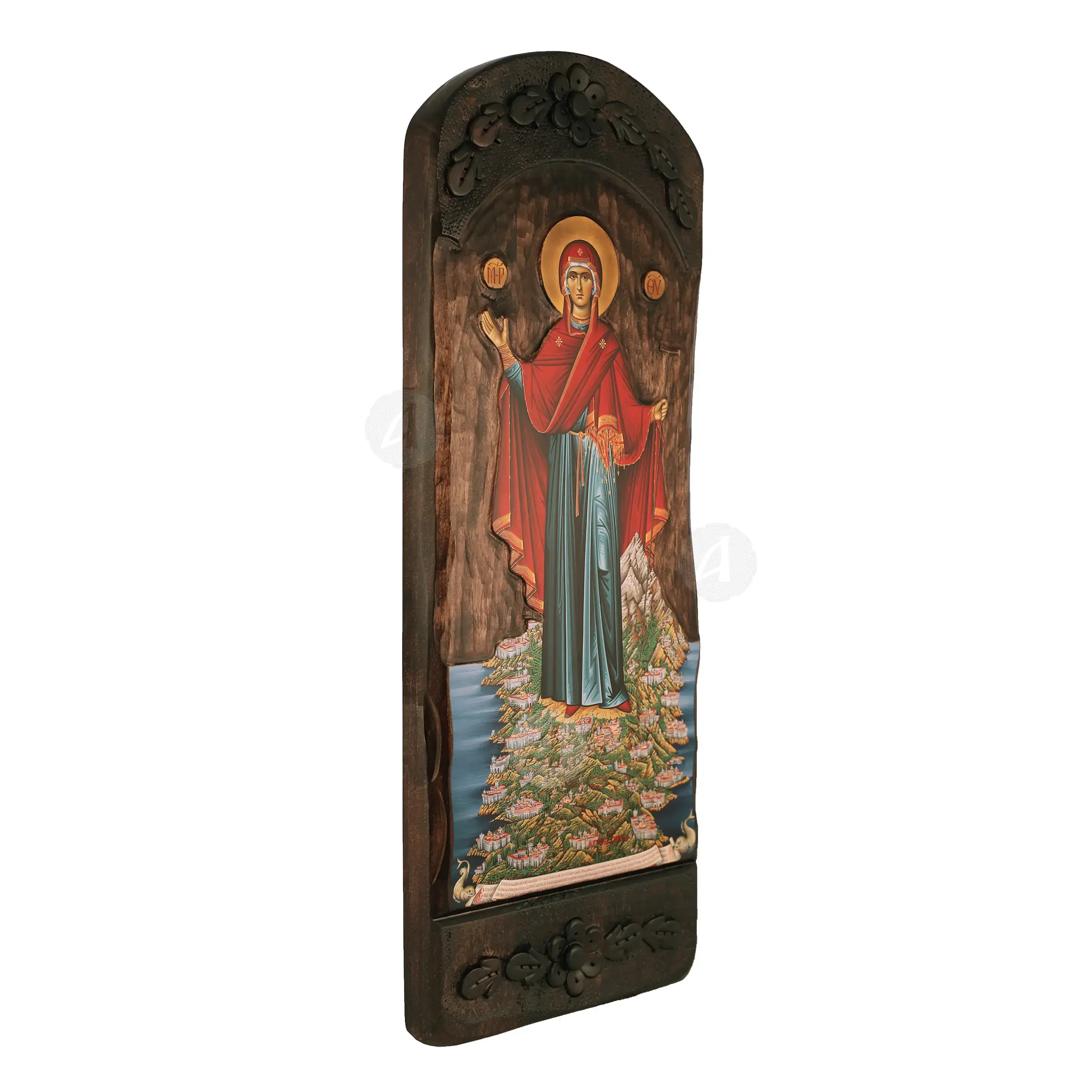 Λιθογραφία της Παναγίας της Αθωνίτισσας σε φυσικό ξύλο πελεκημένο με το χέρι με σκαλιστά διακοσμητικά λουλούδια.