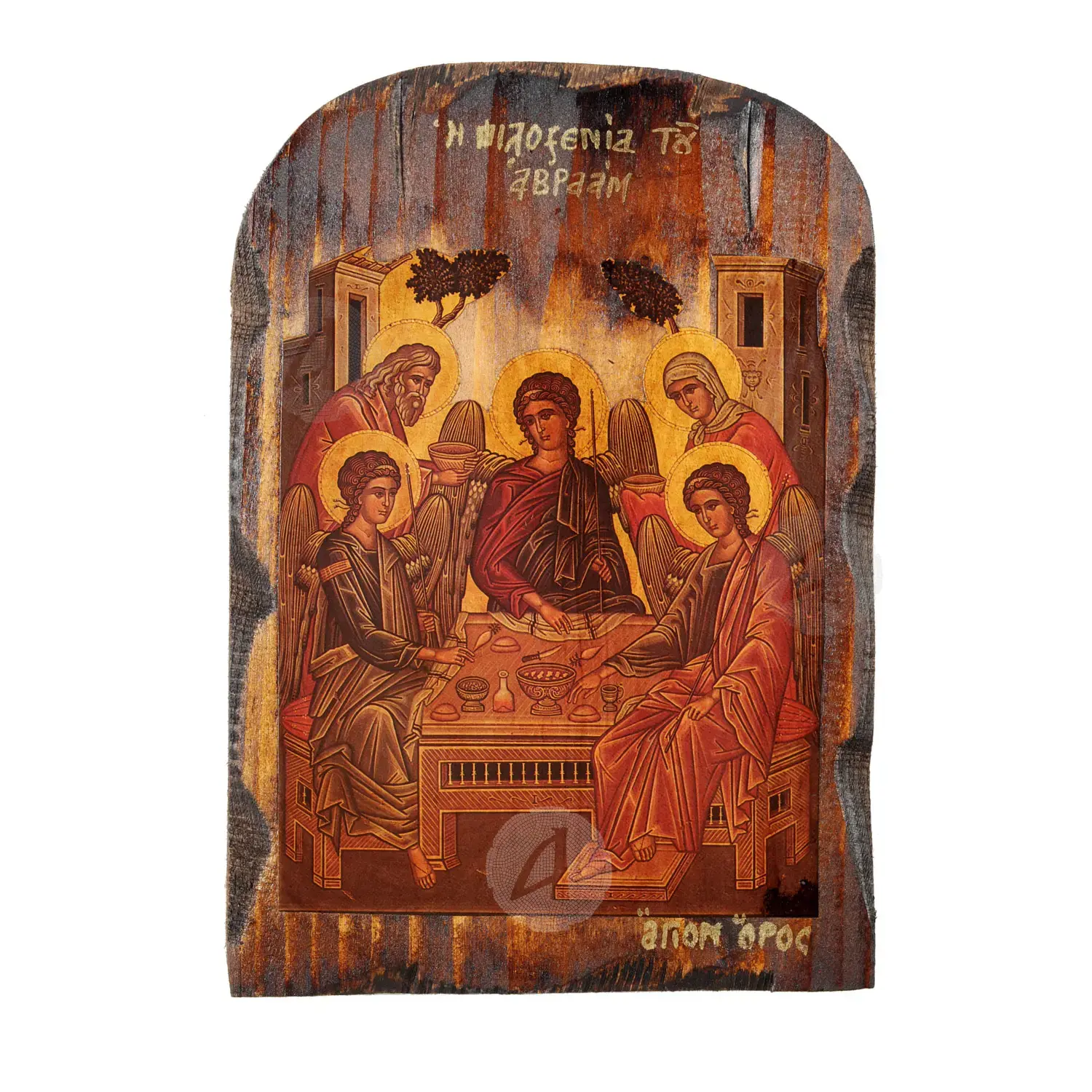 Λιθογραφία (εικόνα) της Φιλοξενίας του Αβραάμ παλαιωμένη σε ξύλο πεύκου με τρέσες.