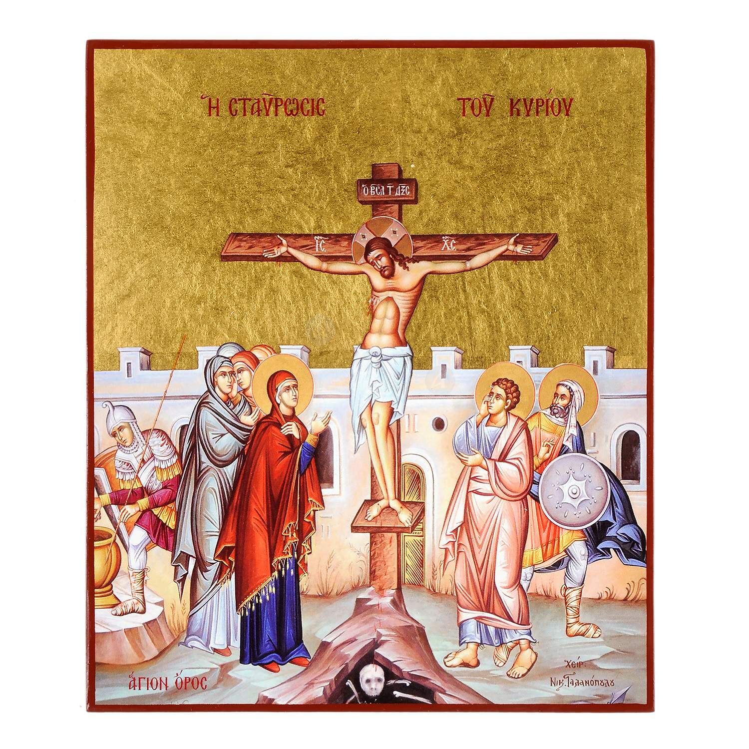Αγιορείτικη μεταξοτυπία της Σταυρώσεως του Κυρίου σε ξύλο με πραγματικό φύλλο χρυσού. Εικόνα του Δωδεκαόρτου.