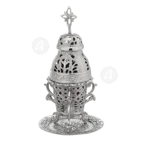 Αγιορείτικο καντήλι σπιτιού επιτραπέζιο επινικελωμένο με σκαλιστή διακόσμηση και στρόγγυλη βάση.