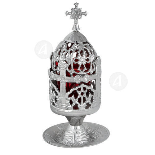 Αγιορείτικο καντήλι επιτραπέζιο επινικελωμένο με στρόγγυλη βάση και σκαλιστή διακόσμηση.