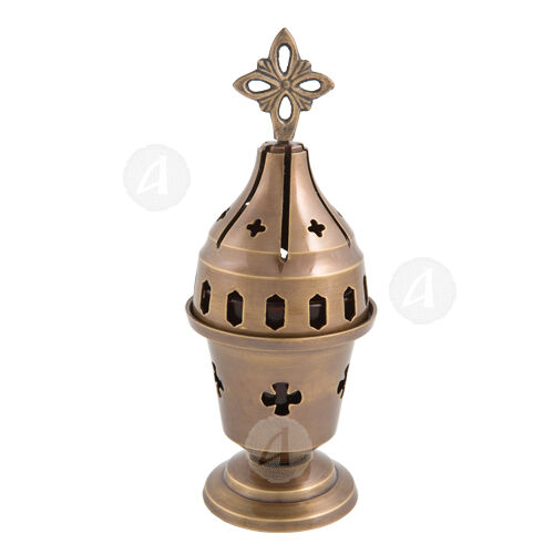 Αγιορείτικο καντήλι σπιτιού επιτραπέζιο μπρούτζινο με Σταυρό στη κορυφή.