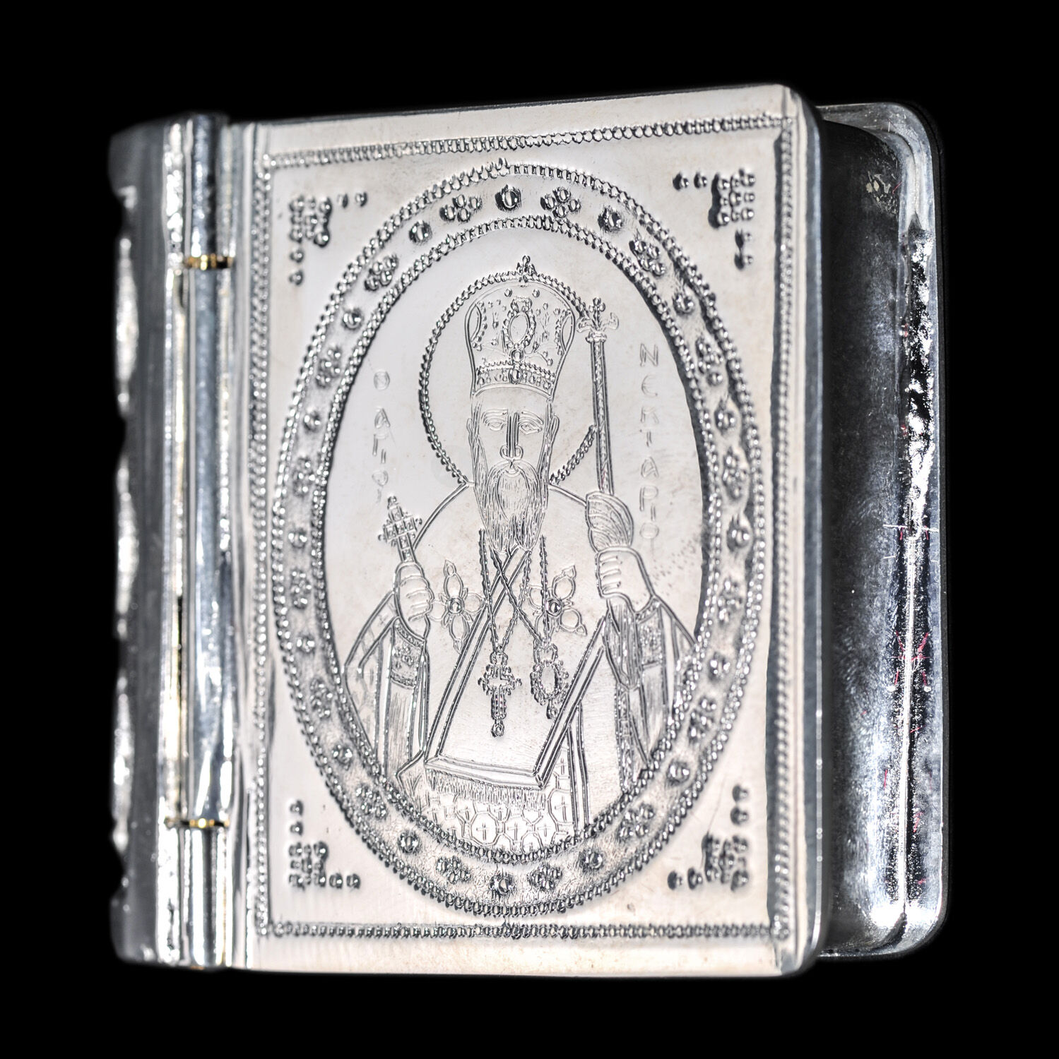 Χειροποίητη ασημένια λειψανοθήκη με εγχάρακτη παράσταση του Αγίου Νεκταρίου.