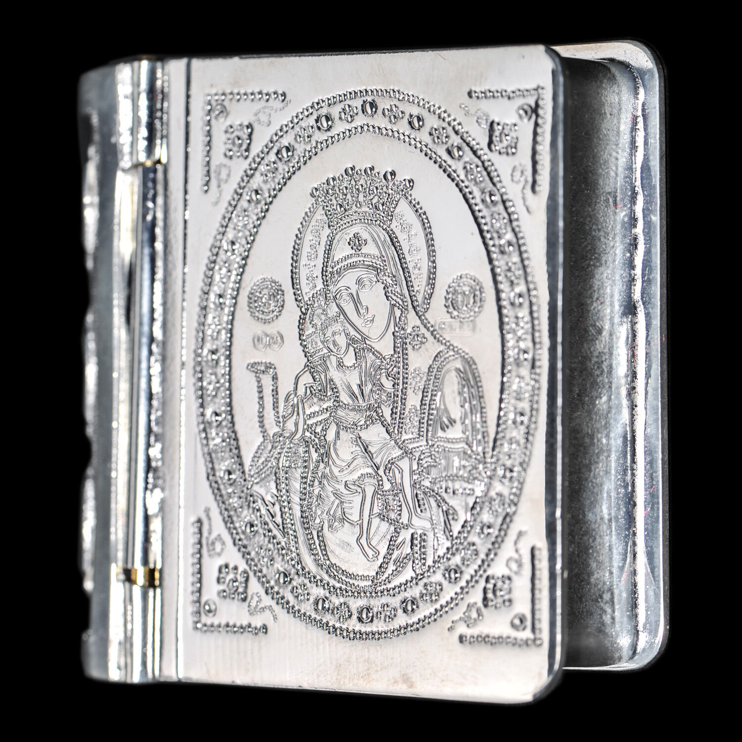 Χειροποίητη ασημένια λειψανοθήκη με εγχάρακτη παράσταση της Παναγίας Άξιον Εστί.