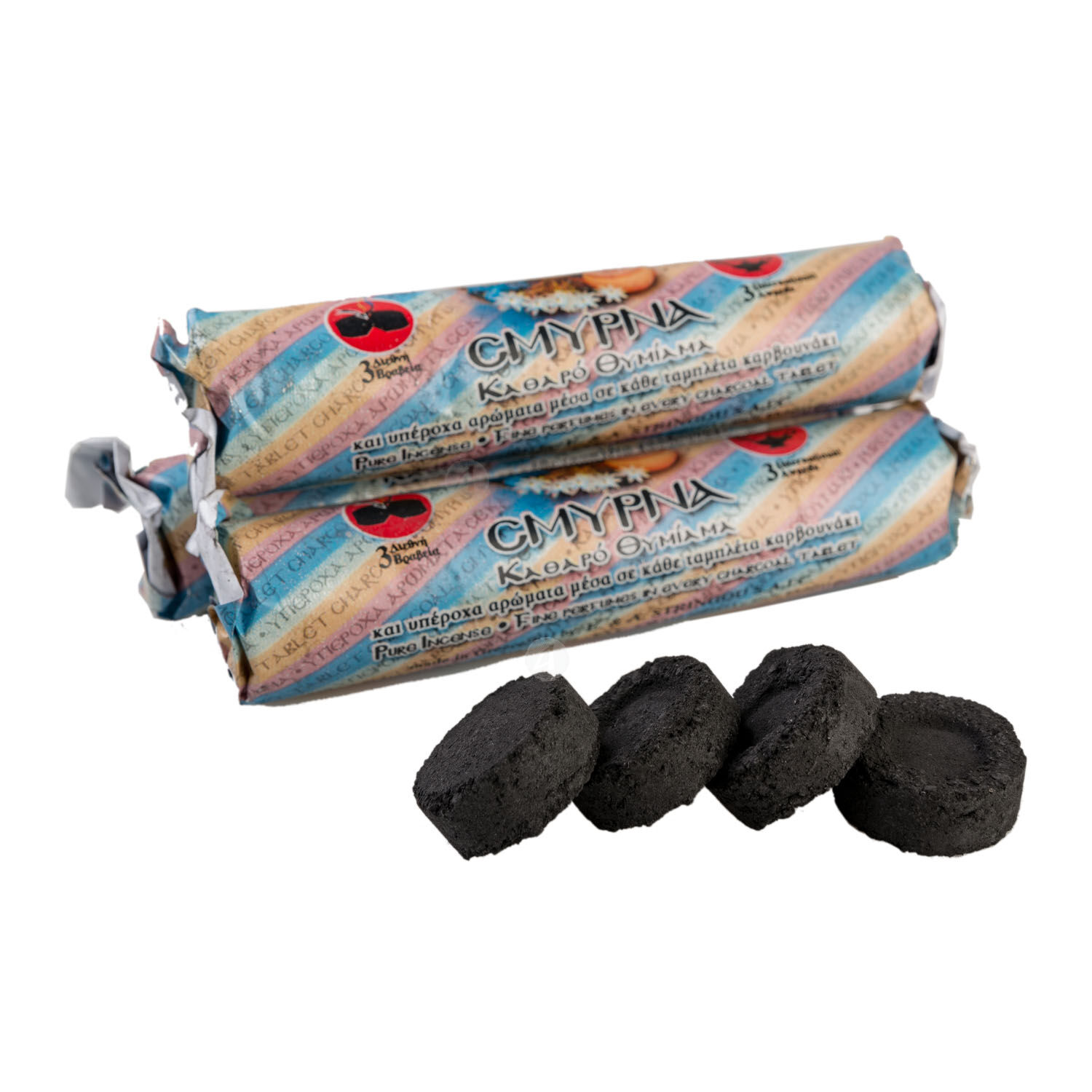 Slow combustion scented charcoals (Smyrna) from Mount Athos for incense burning.