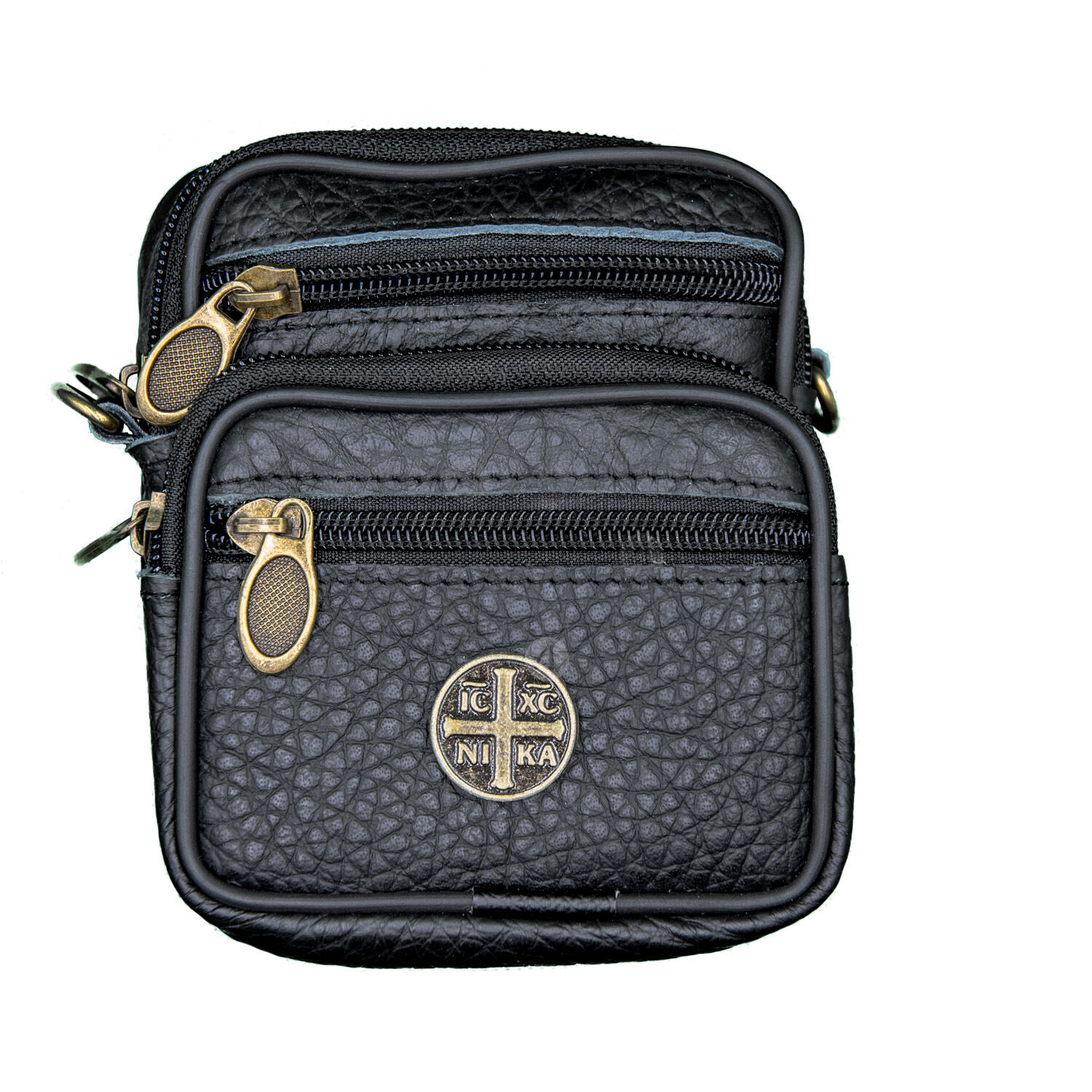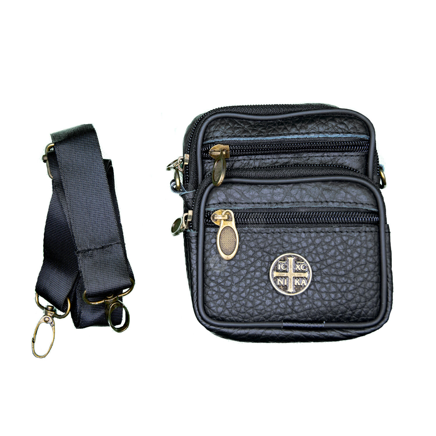 Mount Athos leather bag with four pockets, shoulder strap and a badge IC XC NIKA.