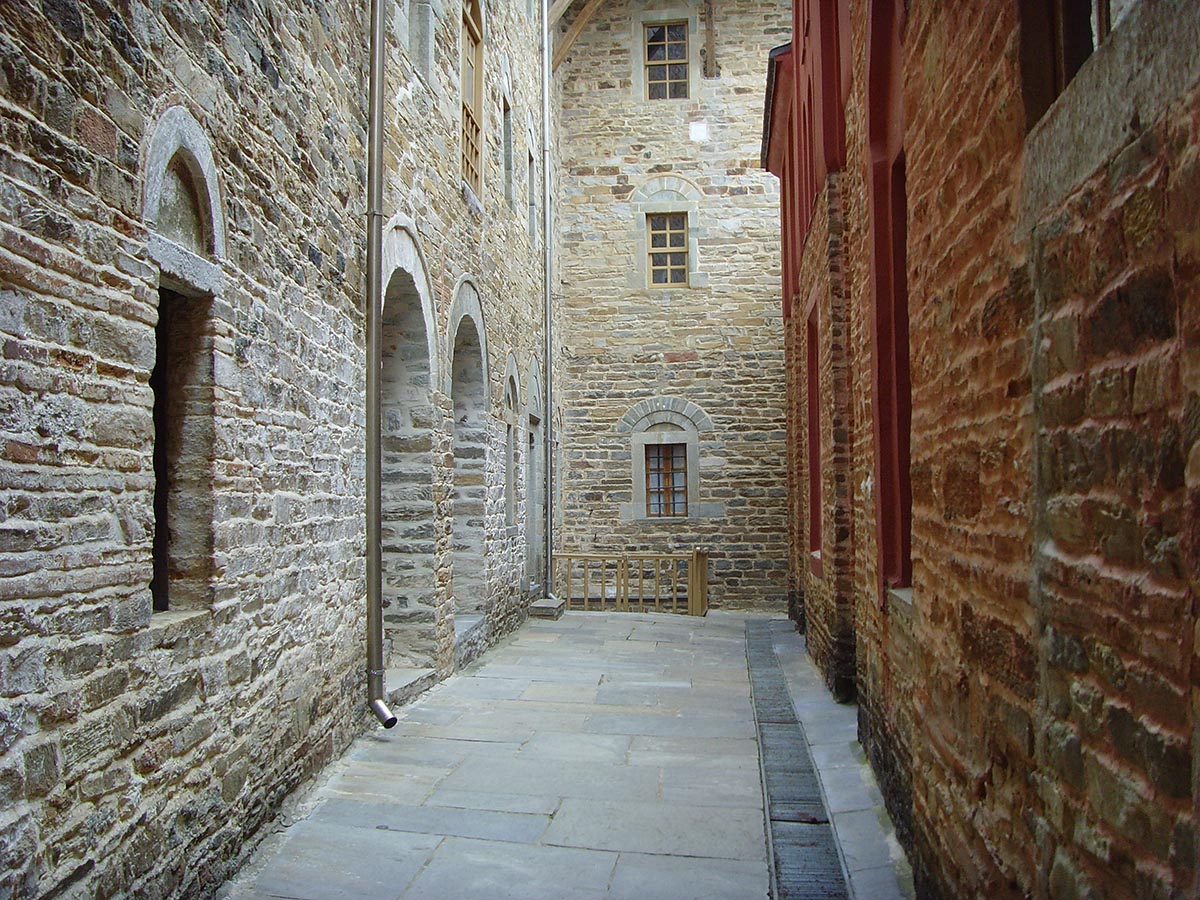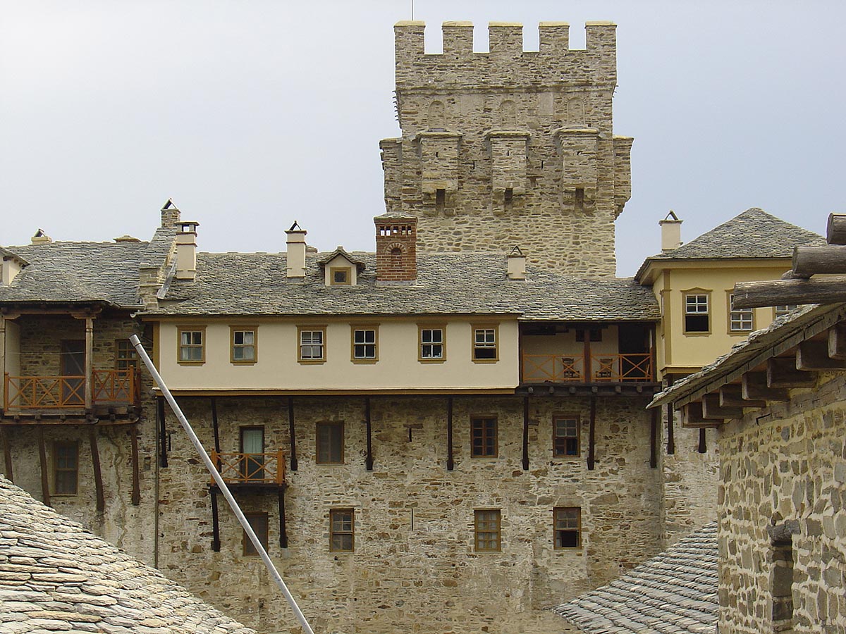 Το Καθολικό κτίστηκε το 1456 από τον πατριάρχη Ιερεμία και ολοκληρώθηκε 1546. Την ίδια χρονολογία τοιχογραφήθηκε και το εσωτερικό του ναού από τον ζωγράφο της Κρητικής Σχολής Θεοφάνη. Το σπουδαιότερο έργο τέχνης στο ναό είναι η ψηφιδωτή εικόνα του Αγίου Νικολάου του Στρειδά, του 14ου αιώνα. Η Τράπεζα ανακαινίστηκε το 1780 και σ’ αυτή βρίσκονται πολλές τοιχογραφίες που αποδίδονται επίσης στη Κρητική Σχολή. Η Μονή έχει 6 παρεκκλήσια, 4 Κελιά στις Καρυές και 44 Καλύβες στην περιοχή της Καψάλας.