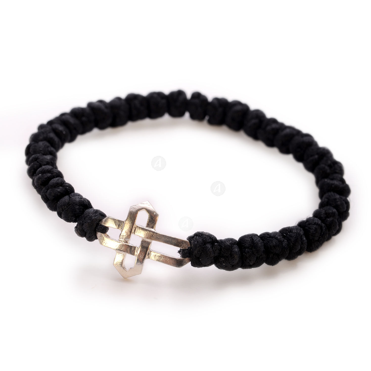 Αγιορείτικο μεταξωτό και λαστιχένιο κομποσκοίνι σε μαύρο χρώμα με χειροποίητο σταυρό από ασήμι 925°.