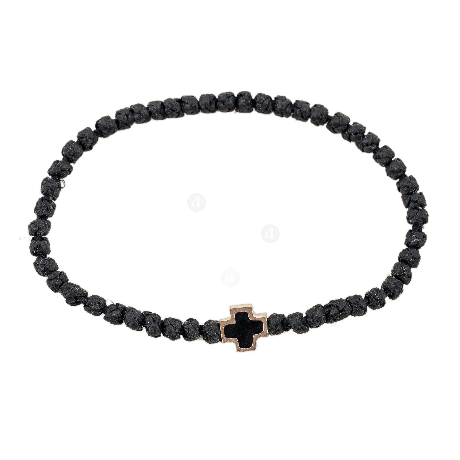 Αγιορείτικο μεταξωτό και λεπτόκομπο κομποσκοίνι σε μαύρο χρώμα με χειροποίητο σταυρό από ασήμι 925° και μαύρο σμάλτο.