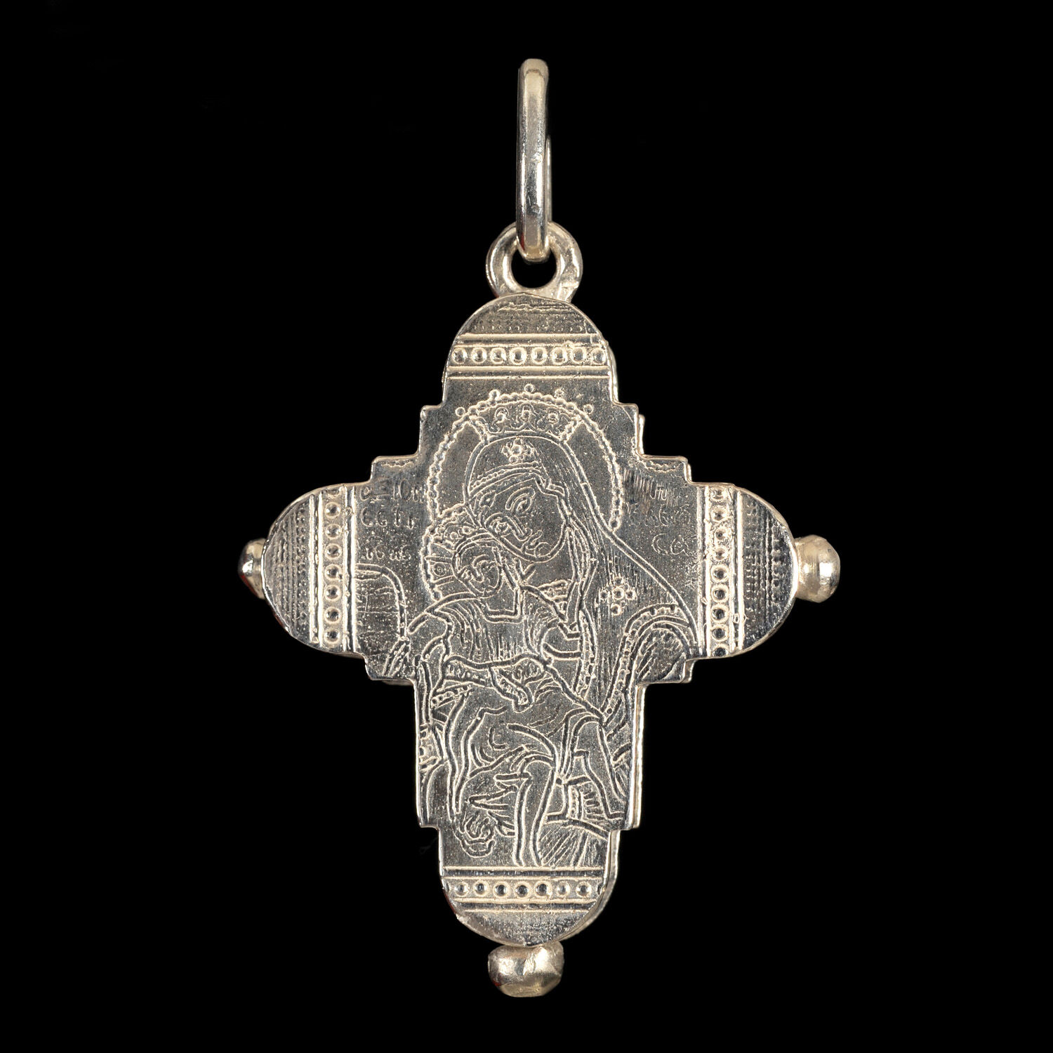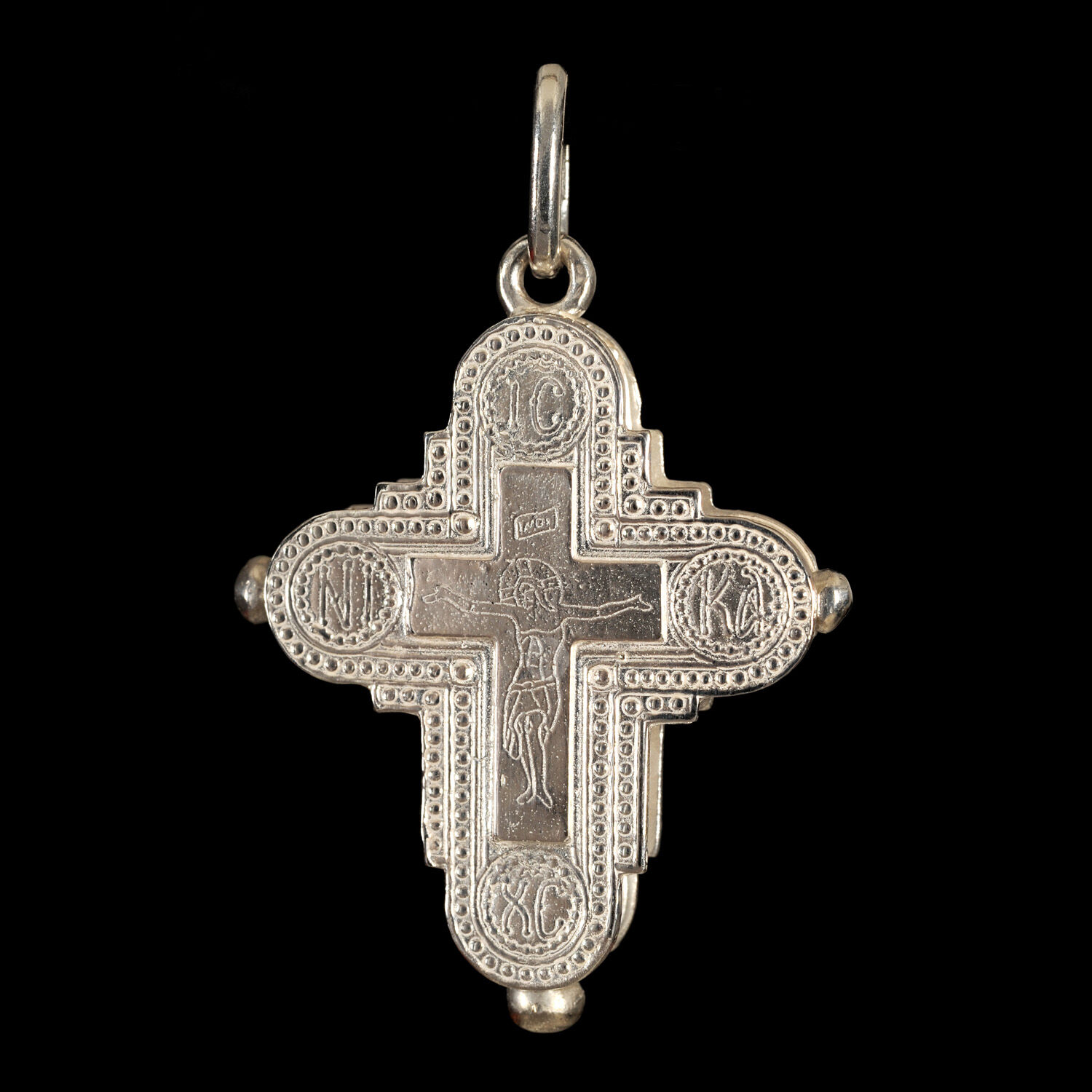 Αγιορείτικος κρεμαστός σταυρός λαιμού από ασήμι 925° με απεικόνιση τον Εσταυρωμένο Χριστό και τη Παναγία.