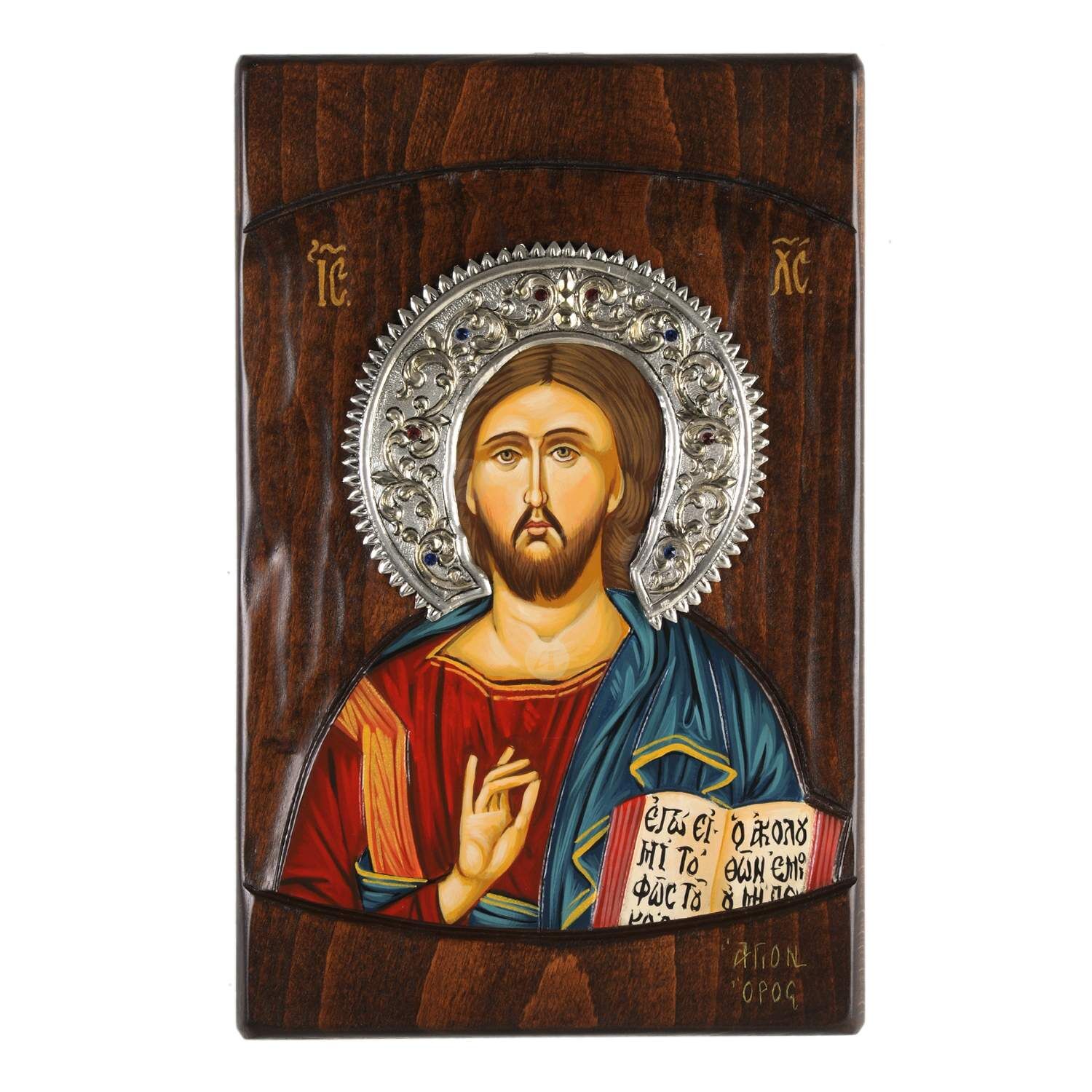 Hand-painted icon on natural wood with halo from 925° silver, gold-plated details and semiprecious stones. Dimensions: 32x23cm.