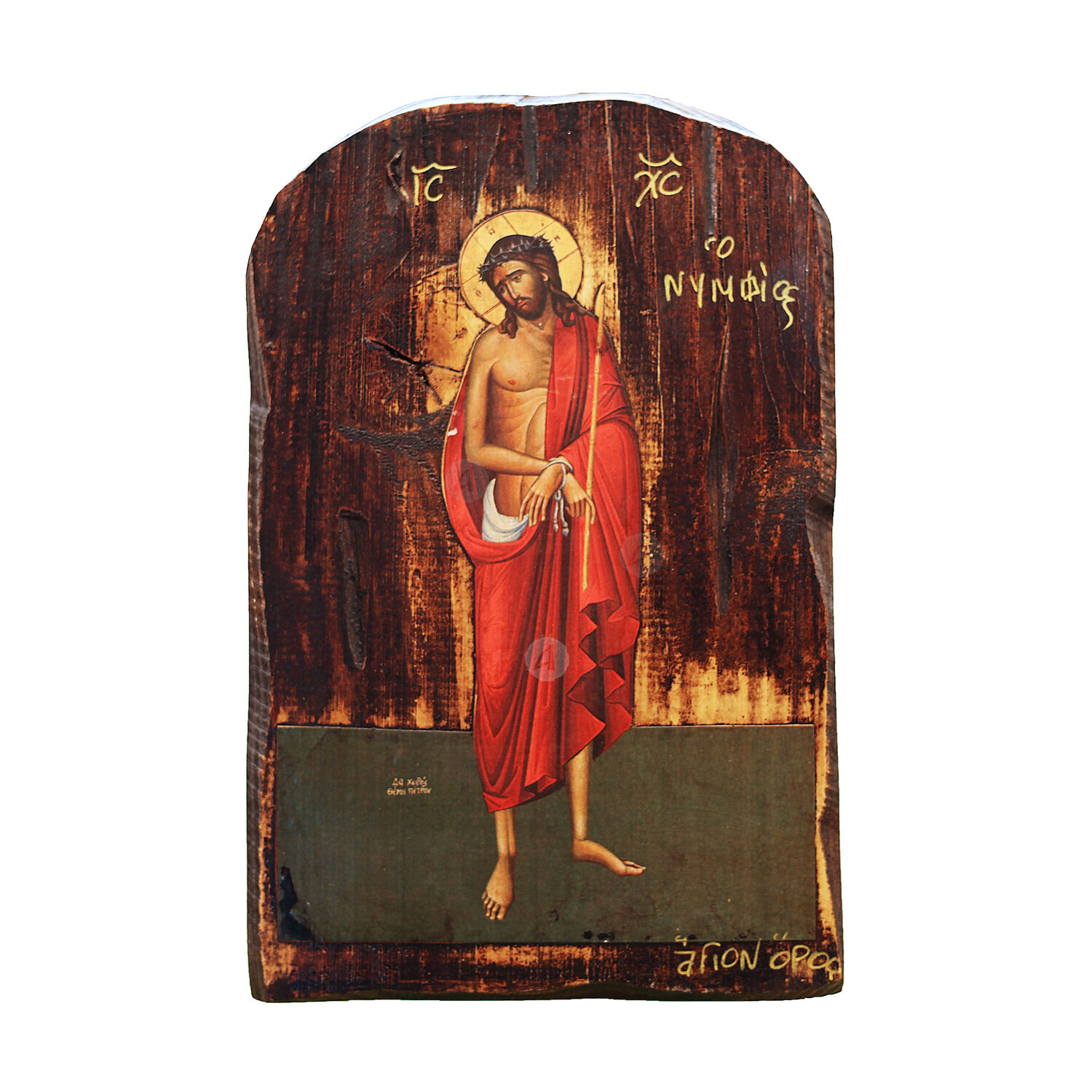Mount Athos weathered lithography (icon) of Jesus Christ Nimfios in pine wood with carved decoration.