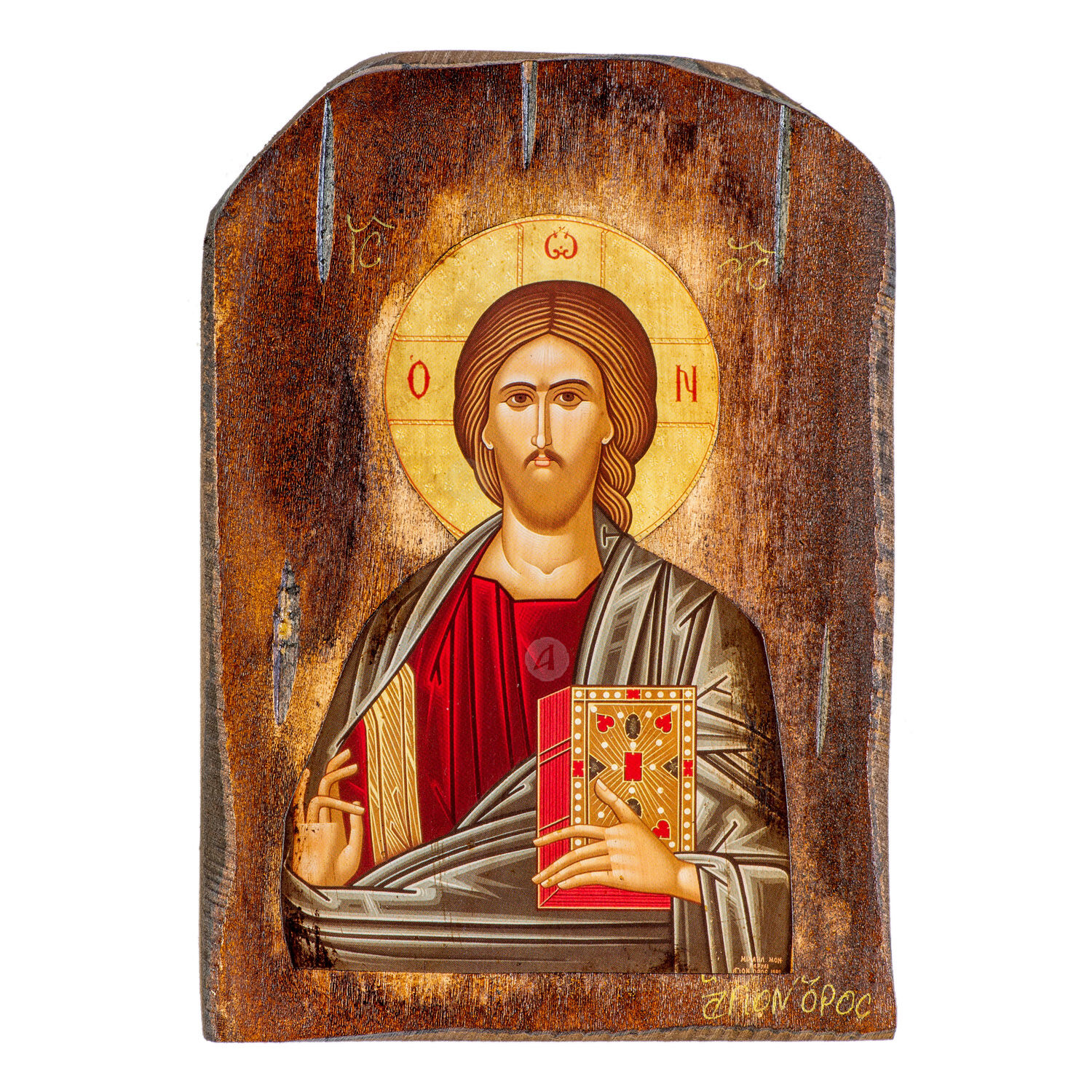 Mount Athos weathered lithography (icon) of Jesus Christ Pantocrator in pine wood with carved decoration.
