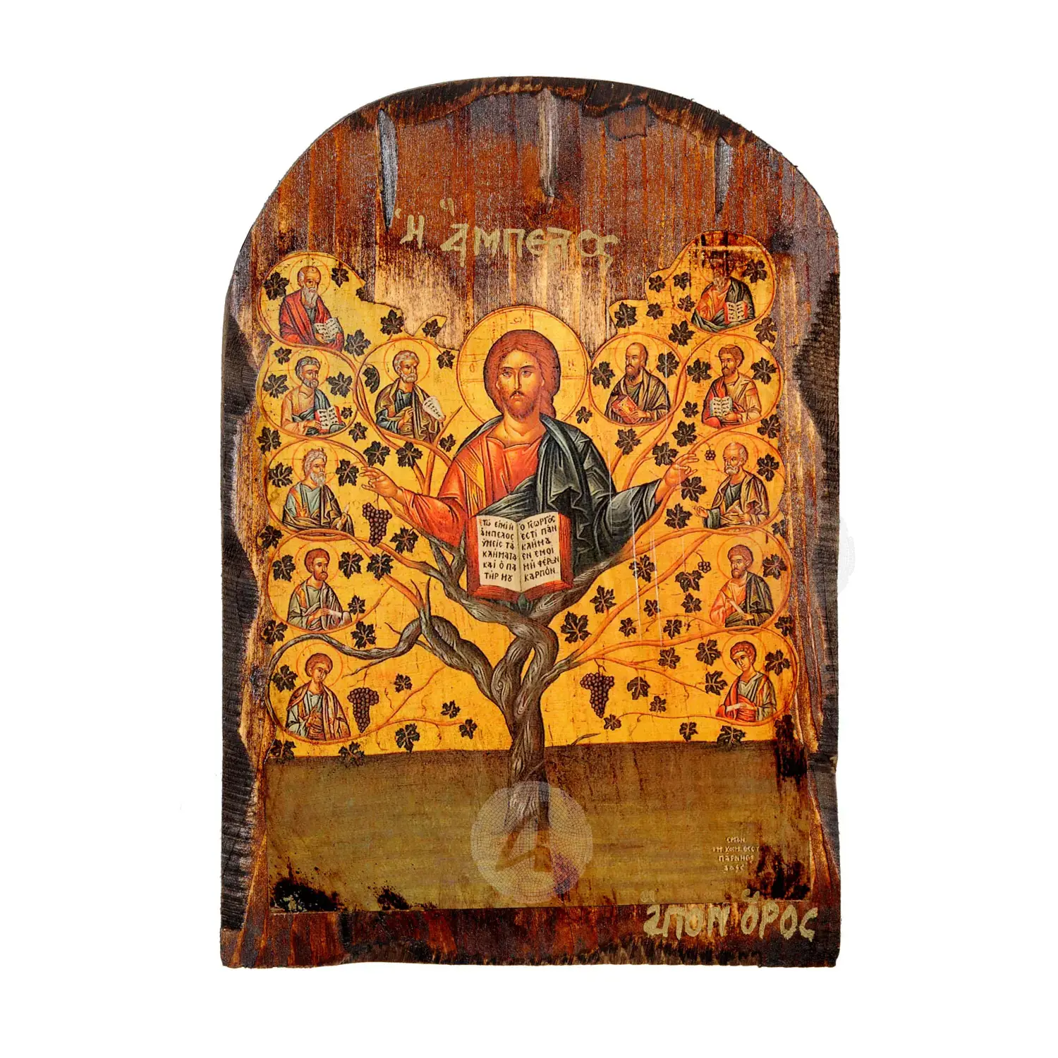 In the New Testament Christ is likened to the Vine that gives life to the branches. The branches are well-groomed, united with the Vine and produce spiritual fruits. The Twelve Apostles sit on the branches of the Vine and the Leaders, Peter and Paul, on top of it. Christ is depicted in the center with the Gospel open.