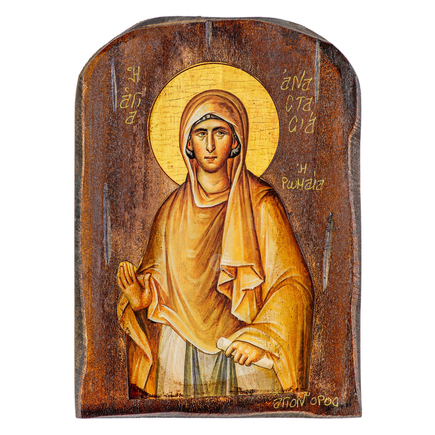 Mount Athos weathered lithography (icon) of Saint Anastasia the Martyr of Rome in pine wood with carved decoration.