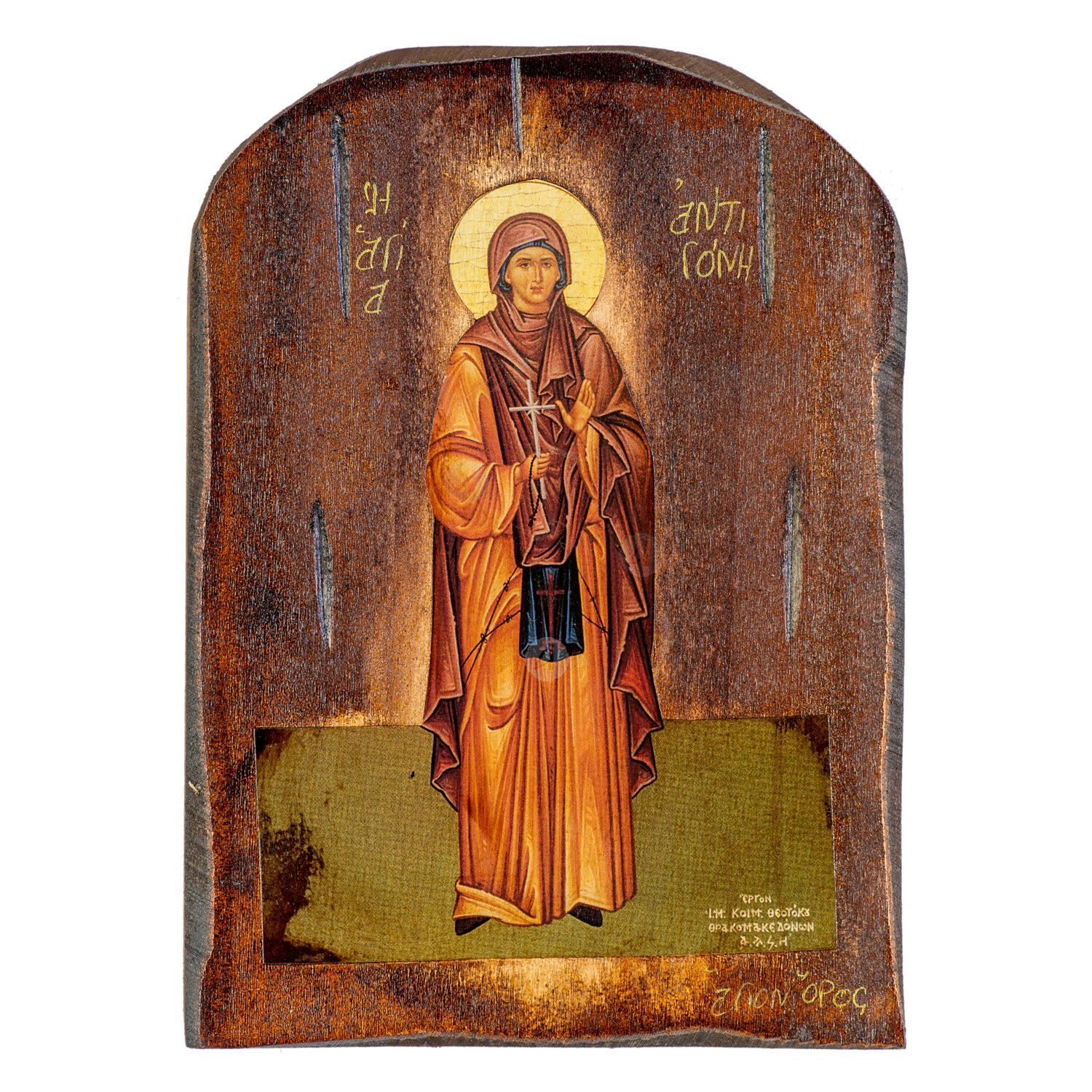 Mount Athos weathered lithography (icon) of Saint Antigone the Martyr in pine wood with carved decoration.