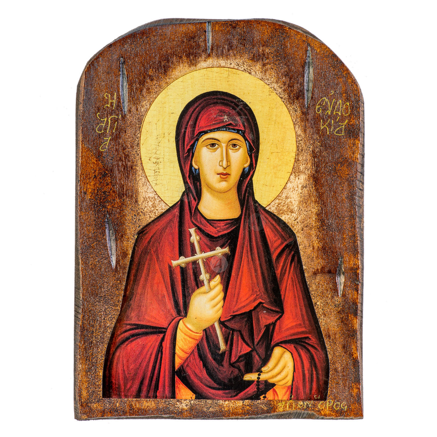 Mount Athos weathered lithography (icon) of Saint Eudokia the Martyr in pine wood with carved decoration.