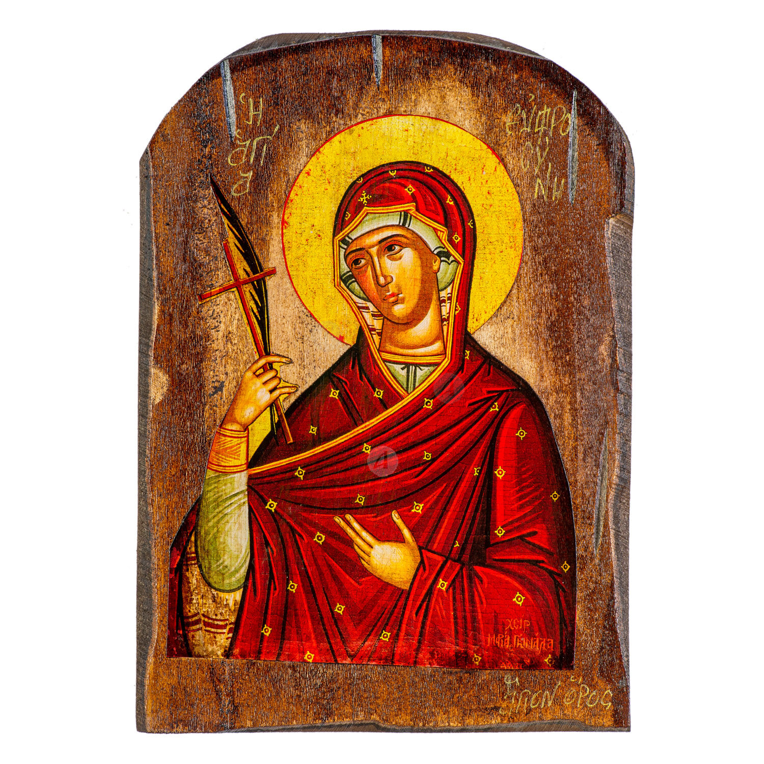 Mount Athos weathered lithography (icon) of Saint Euphrosyne of Alexandria in pine wood with carved decoration.