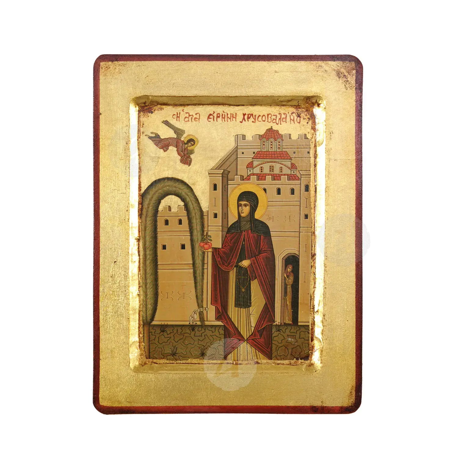 Lithography (icon) of Saint Irene Chrysovalantou with real gold leaf in MDF.