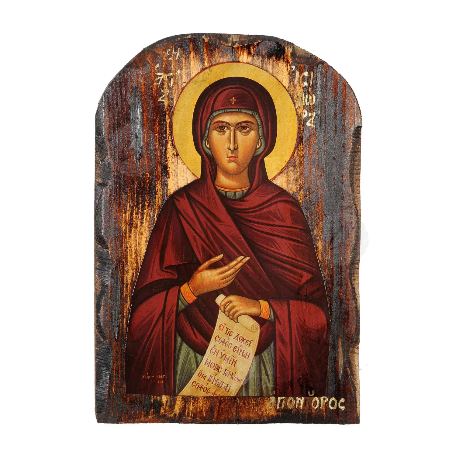 Mount Athos weathered lithography (icon) of Saint Isidora the Fool For Christ in pine wood with carved decoration.