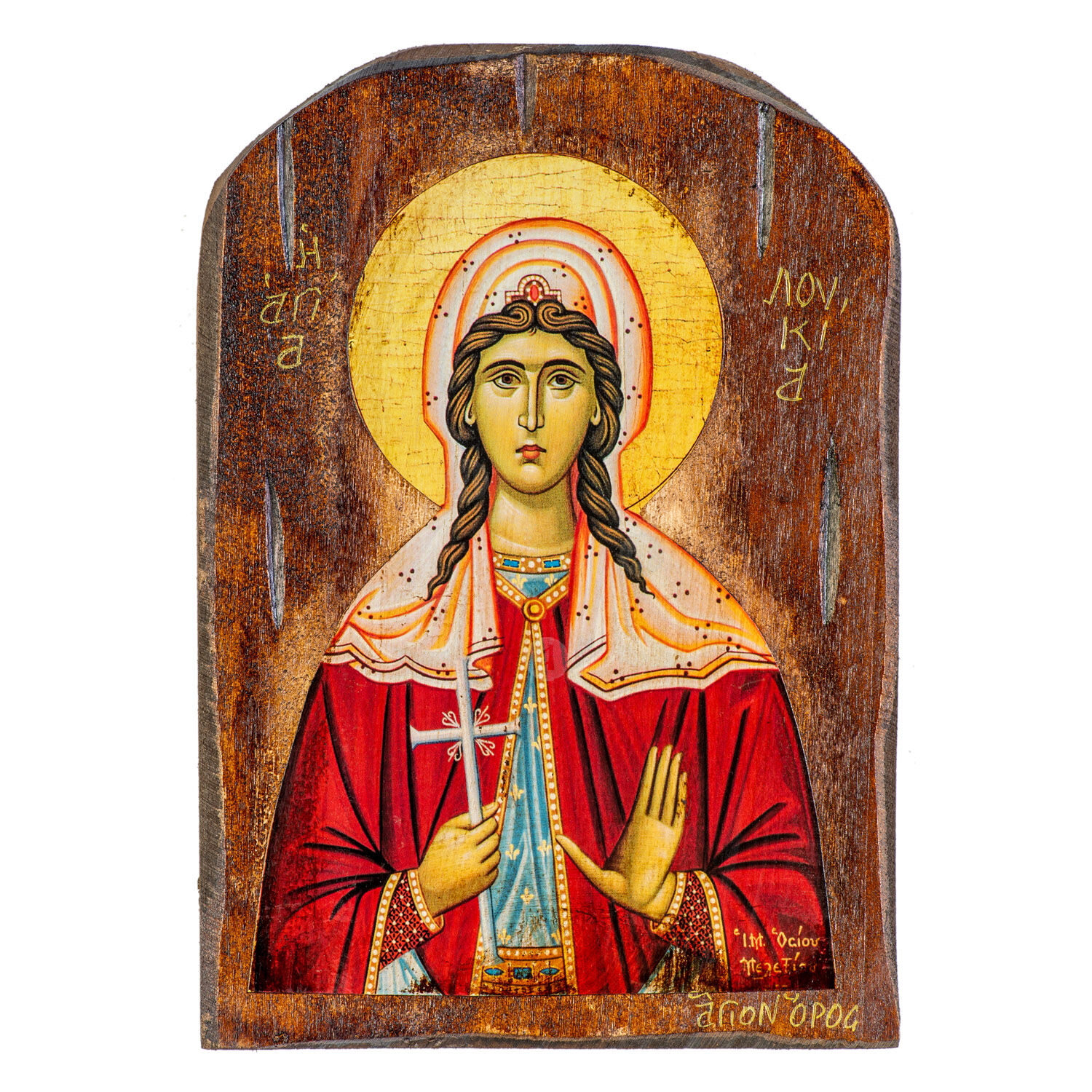 Mount Athos weathered lithography (icon) of Saint Lucia the Virgin Martyr in pine wood with carved decoration.