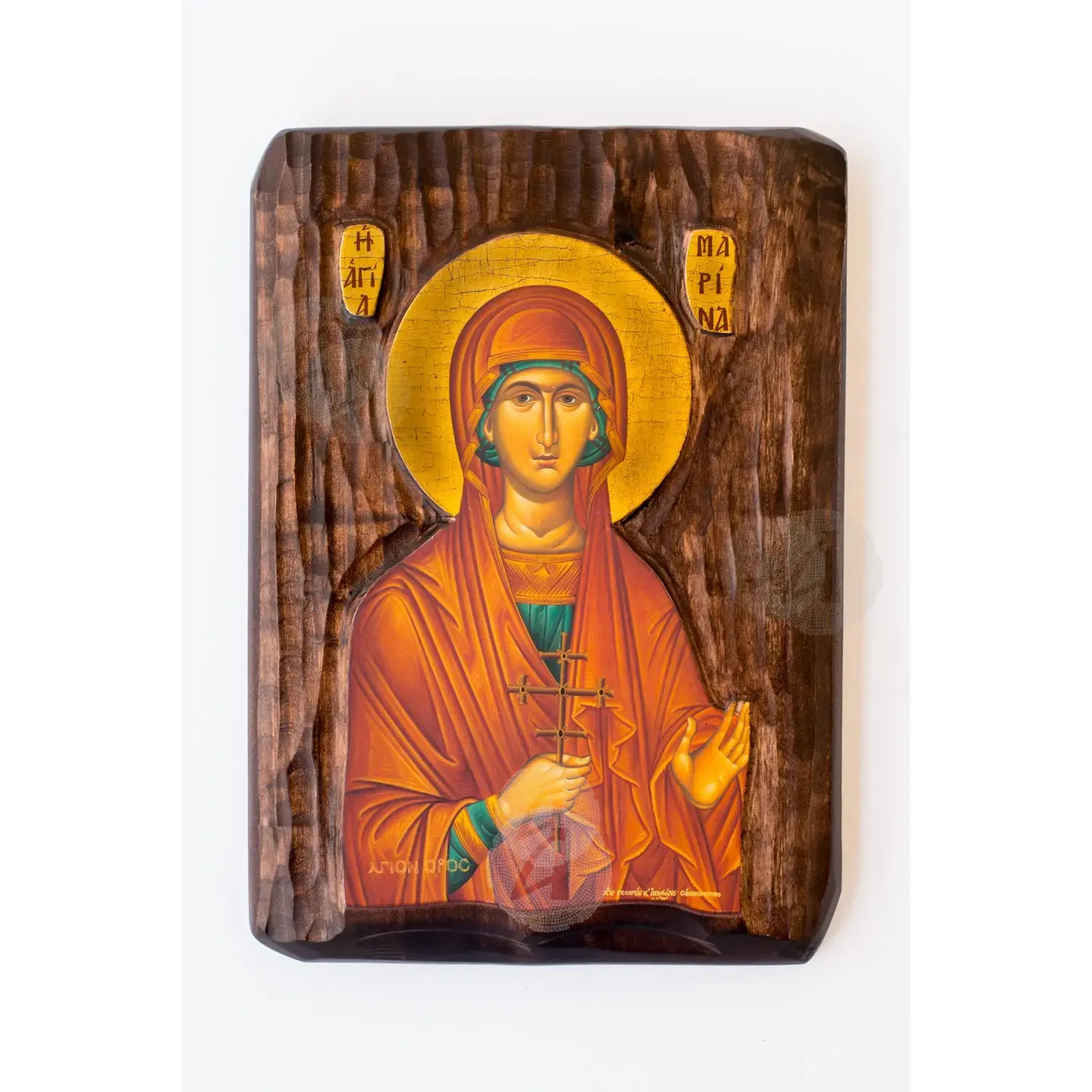 Mount Athos lithography (icon) of Saint Marina the Great Martyr on natural wood carved by hand.