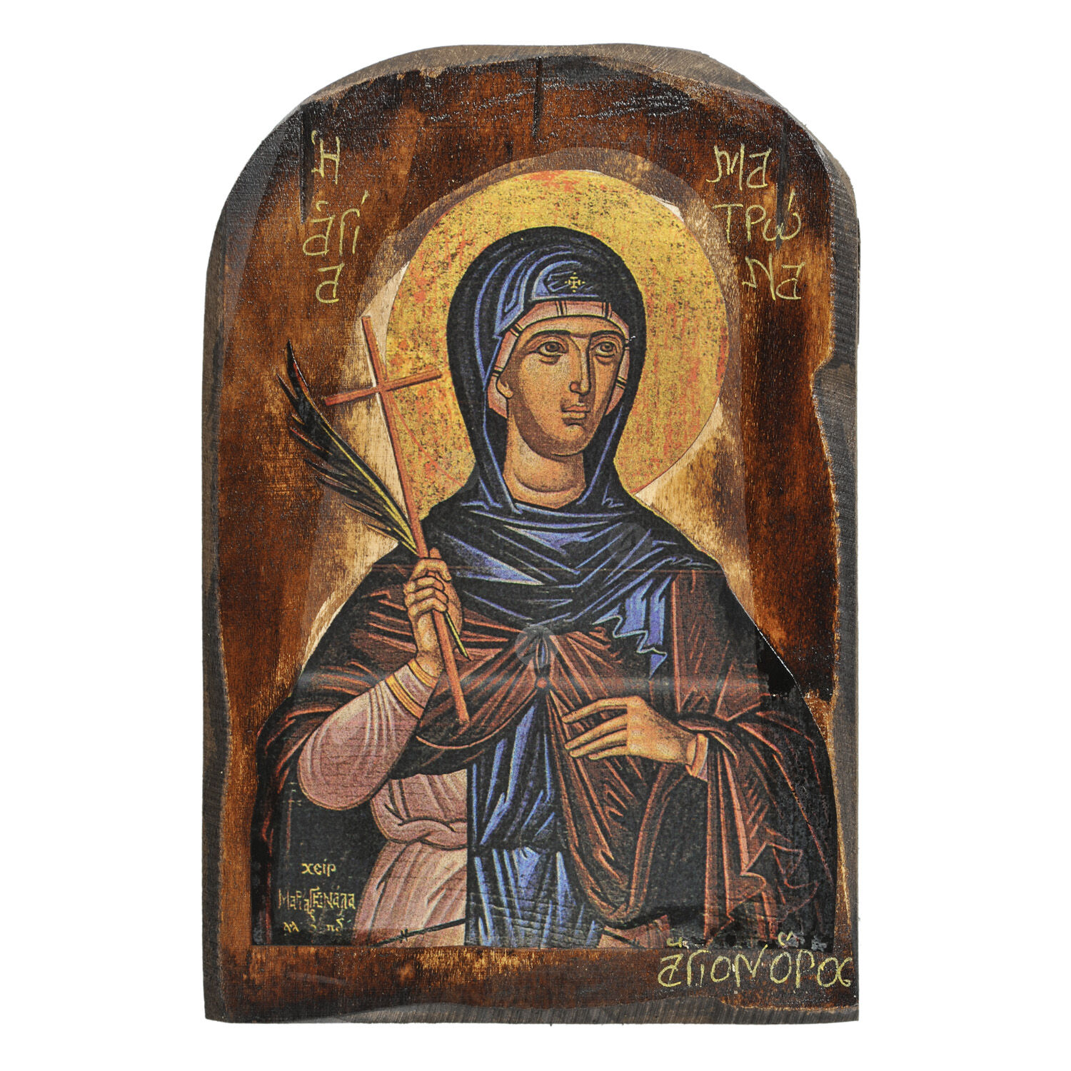 Mount Athos weathered lithography (icon) of Saint Matrona of Thessalonica in pine wood with carved decoration.
