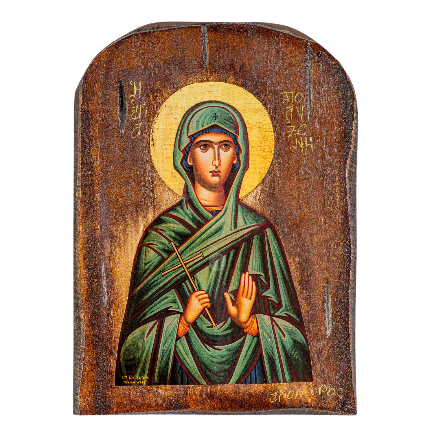 Mount Athos weathered lithography (icon) of Saint Polyxene the Righteous in pine wood with carved decoration.