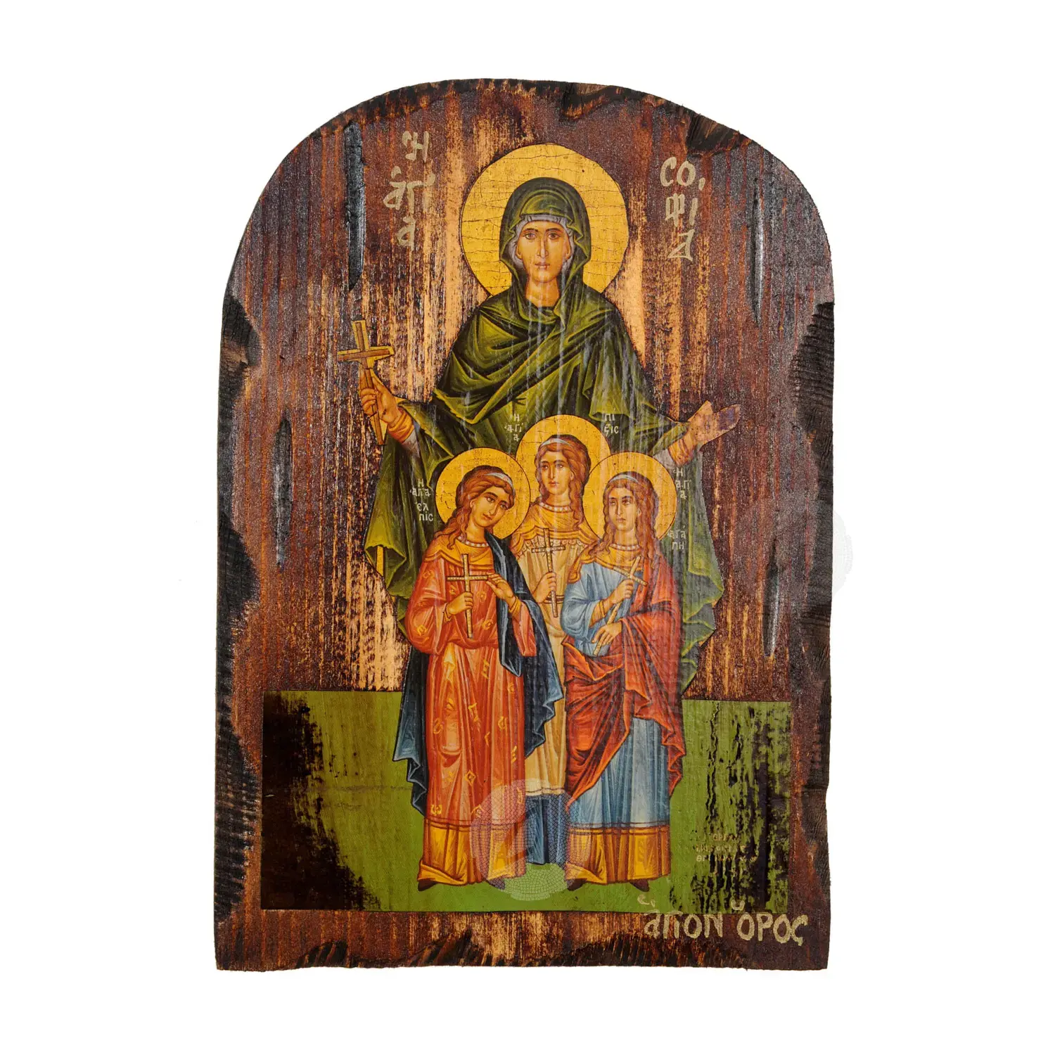 Mount Athos weathered lithography (icon) of Saint Sophia in pine wood with carved decoration.