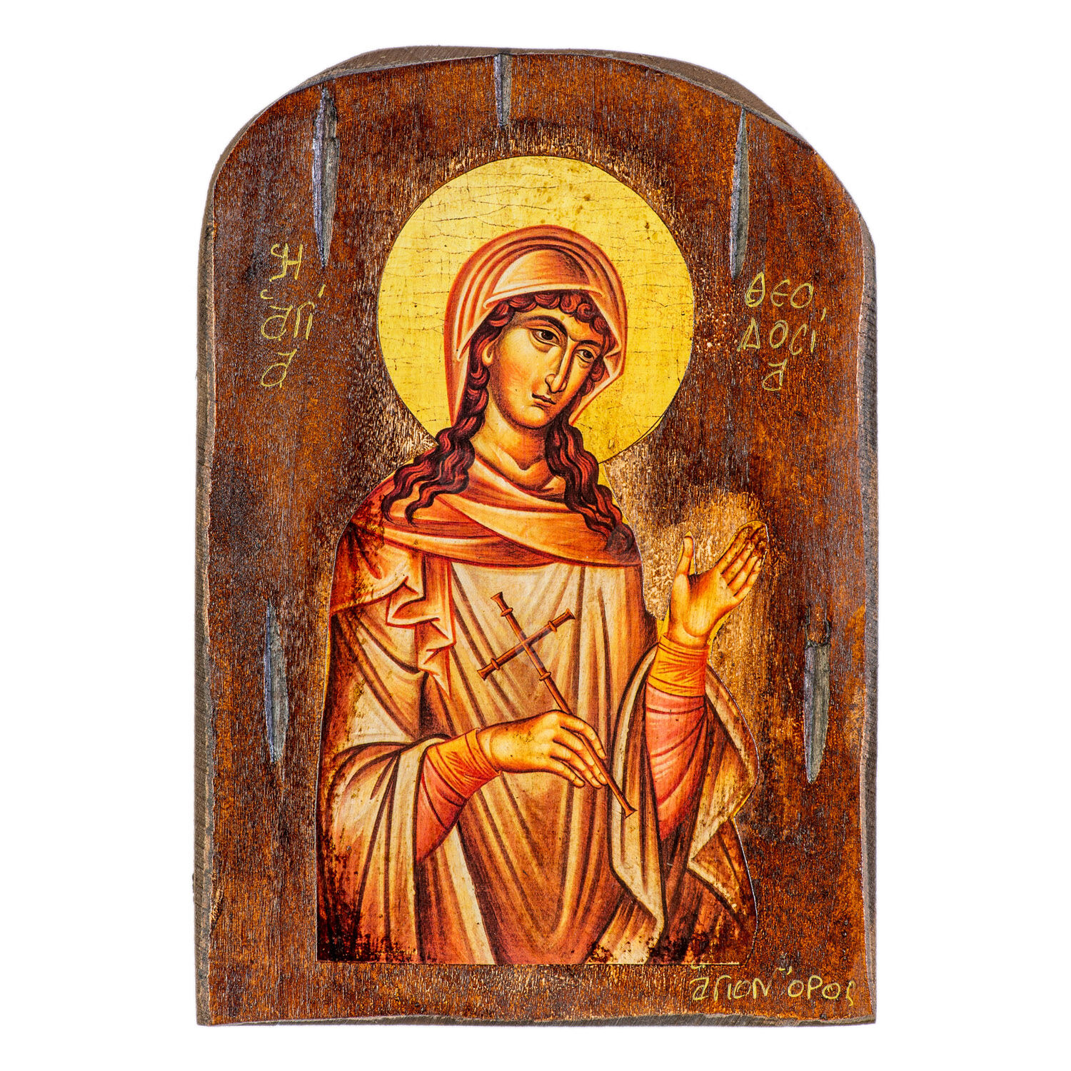 Mount Athos weathered lithography (icon) of Saint Theodosia the Virgin Martyr in pine wood with carved decoration.