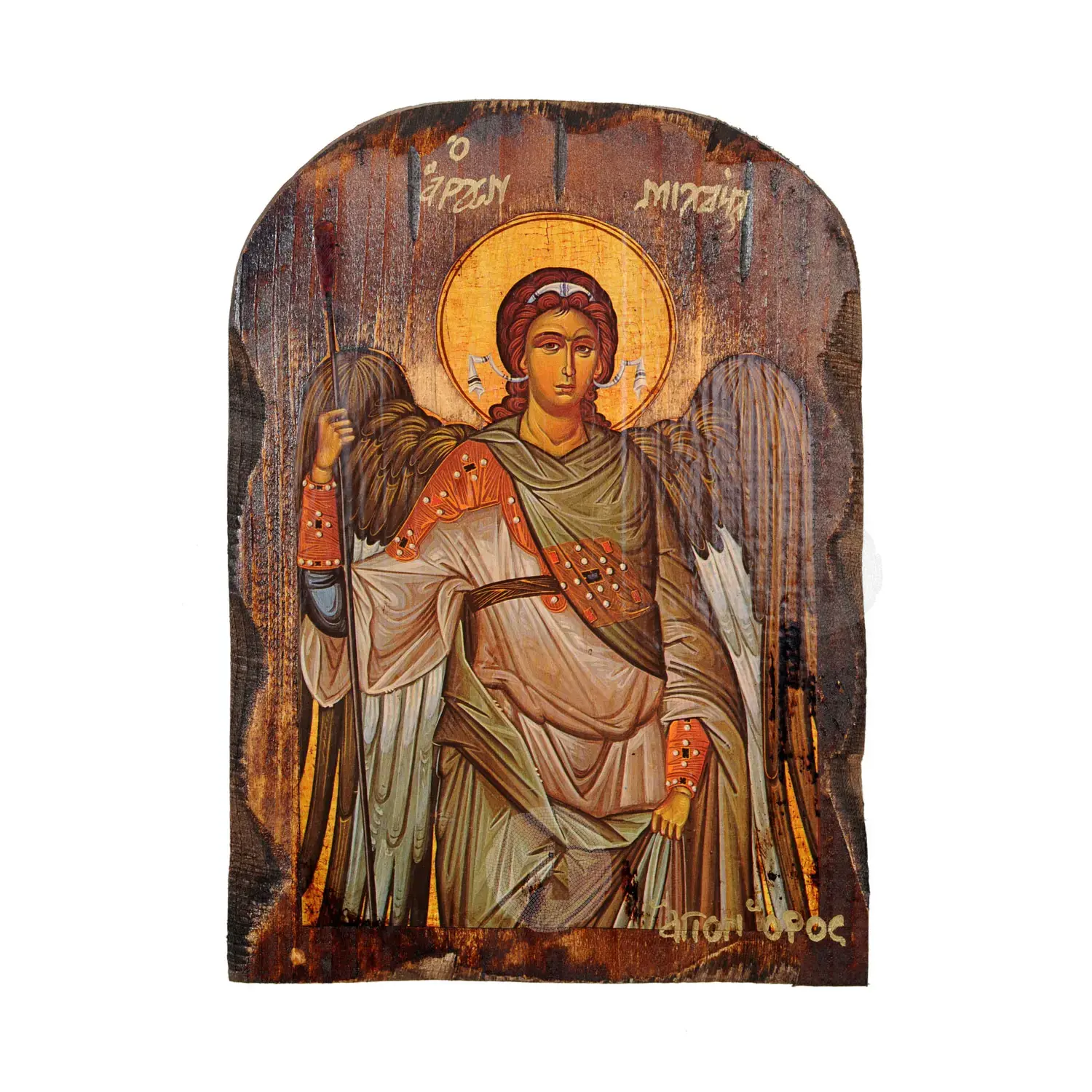 Mount Athos weathered lithography (icon) of Archangel Michael the Taxiarch in pine wood with carved decoration.